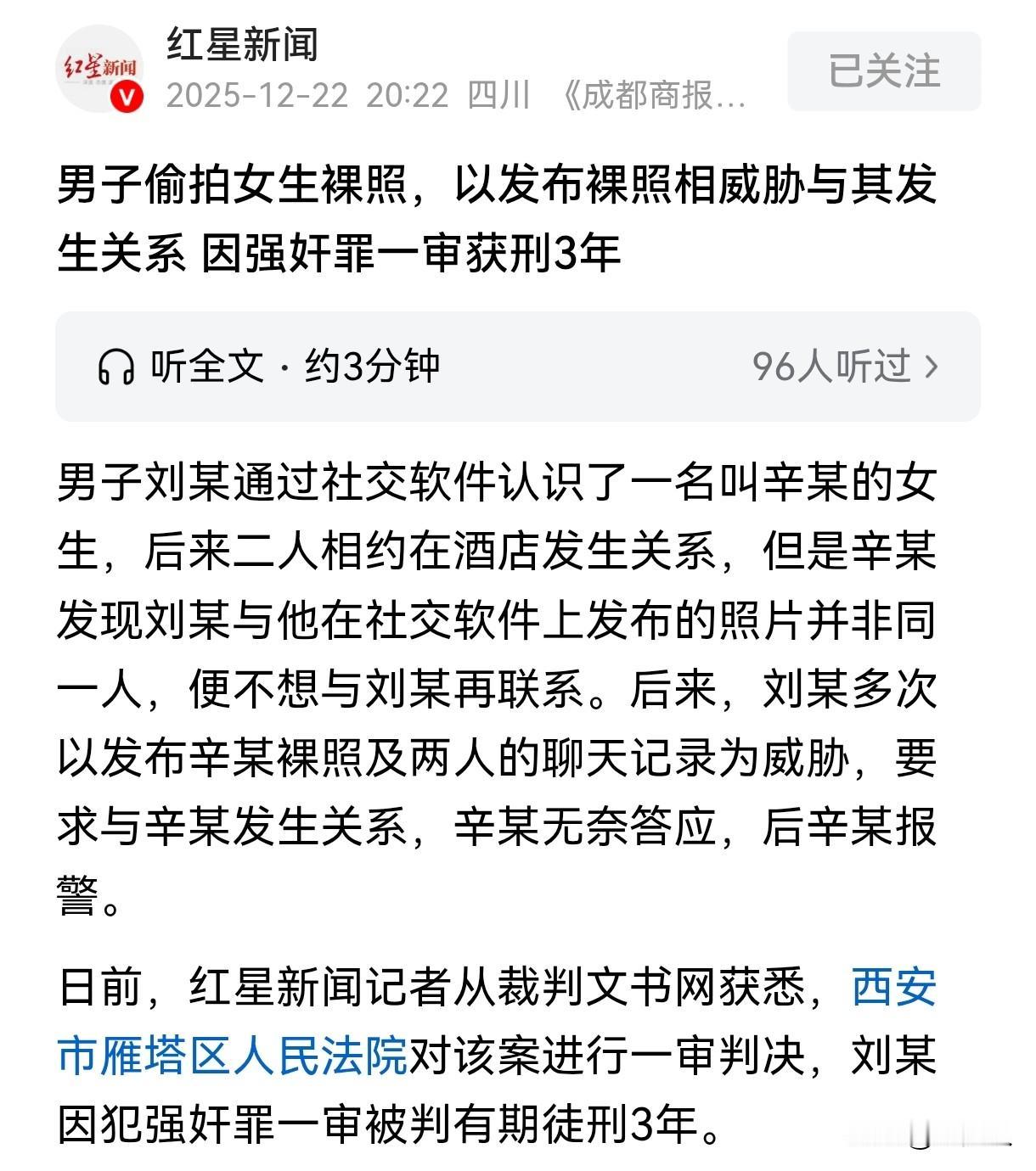 陕西西安,女子在网上认识了一名男子,两人交往不到一个月,约着去酒店开房,见面后,女子意识到对方不是照片里的人,可还是跟对方发生了关系,之后她想跟对方断了联系,两人不再来往。可男子却说要把聊天记录和女子照片发出去,女子无奈,再次跟对方发生亲密行为,可男子并未满足,继续威胁女子,女子忍无可忍,报了警,男子悲剧了。 辛某是一名在校学生,青春洋溢,对爱情很是向往,可她却因为一次网络交友,让自己陷入了无尽的痛苦和恐惧之中。 2024年6月,她在交友软件上认识了一名男子刘某,刘某在交友软件上的照片帅气迷人,一下子就吸引到了她。 辛某对这个未曾谋面的男子心动了,两人在网上聊的火热,很是投机。 不久后,两人就按捺不住内心的冲动,约好去酒店开房见面。 辛某满心期待着能见到照片中那个帅气潇洒的刘某,可两人见面后,辛某却有些失望。 眼前的刘某和照片上的人简直判若两人,照片上的男子英俊帅气,而现实中的刘某却相貌平平,她感觉来的人并不是自己在网上认识的那个人。 尽管心里落差很大,可辛某还是稀里糊涂的在酒店跟刘某发生了关系。 事后,辛某越想越觉得懊悔,她决定不再和刘某联系,想要彻底结束这段荒唐的“感情”。 可刘某并未轻易放过她,他开始不停的给辛某发消息,要求她出去跟他见面,再一起去酒店。 他威胁辛某,如果辛某再不理他,不去跟他见面,他就把两人的聊天记录和辛某的照片发到她的学校去,让她没脸做人。 听着刘某的威胁,辛某这才后悔不已,她不知道刘某什么时候拍下了她的隐私照片。 她感到既恐惧又无助,一方面担心自己的隐私被泄露,在学校抬不起头来,另一方面又不知道如何摆脱刘某的纠缠。 在刘某的威胁下,辛某迫于无奈,只能再次赶到酒店与刘某见面。 这次见面,对于辛某来说,就是一场噩梦。 两人再次发生了关系,更可怕的是,刘某趁她不注意,又拍下了一些照片,并再次威胁她,要求她随叫随到。 辛某气愤难平,她鼓起勇气报了警。 拍摄他人裸照,属于违法行为。 《民法典》第1032条规定:自然人享有隐私权。任何组织或者个人不得以刺探、侵扰、泄露、公开等方式侵害他人的隐私权。 裸照属于个人私密信息,未经同意拍摄,构成侵权行为,受害者可以要求侵权人停止侵害、消除影响、赔礼道歉,并赔偿精神损害抚慰金等损失。 未经同意,拍摄他人裸照,即使未传播,也可能因侵犯隐私被治安处罚。 《治安处罚法》第42条规定:偷窥、偷拍、窃听、散布他人隐私的,处五日以下拘留或者五百元以下罚款;情节较重的,处五日以上十日以下拘留,可以并处五百元以下罚款。 若拍摄他人隐私照片,用照片骚扰受害者,或者威胁受害者,情节严重的,会构成刑事犯罪。 刘某未经辛某同意,悄悄拍下她的裸照,并用这些照片威胁她,要求辛某跟他发生关系,刘某的行为构成了强奸罪。 强奸罪是指违背妇女意志,使用暴力、胁迫或其他手段强行与妇女发生性关系。 刘某和辛某在网上相识后,两人约好去酒店开房,第一次发生关系两人系自愿。 可之后刘某违背辛某的意志,通过用威胁的手段,强行跟辛某发生关系,其行为构成强奸罪。 最终,一审法院判决刘某犯强奸罪,判处其有期徒刑3年。 有人说,网络交友一定要保持清醒的头脑,很多人都会包装自己,展示自己美好的一面,而隐藏起那些不好的企图。 就像刘某,用帅气英俊的照片吸引他人,实际上却是另外一个模样。 无论男女,都要洁身自好,自尊自爱,不要因为一时的冲动或好奇,就随意与他人发生亲密关系,如身心受到伤害,是没有后悔药的。 在与他人交往过程中,若发现对方有异常行为(如偷拍、威胁的),应立即终止跟对方来往,必要时可以报警求助。