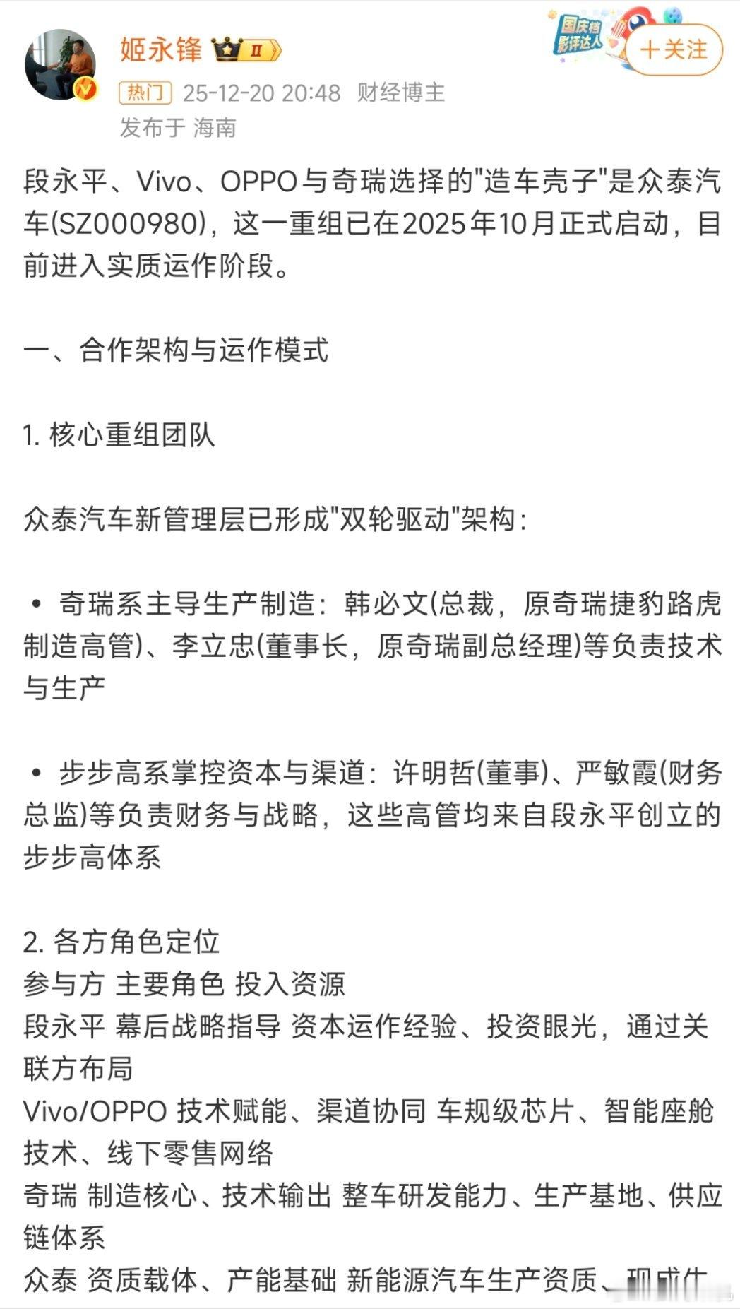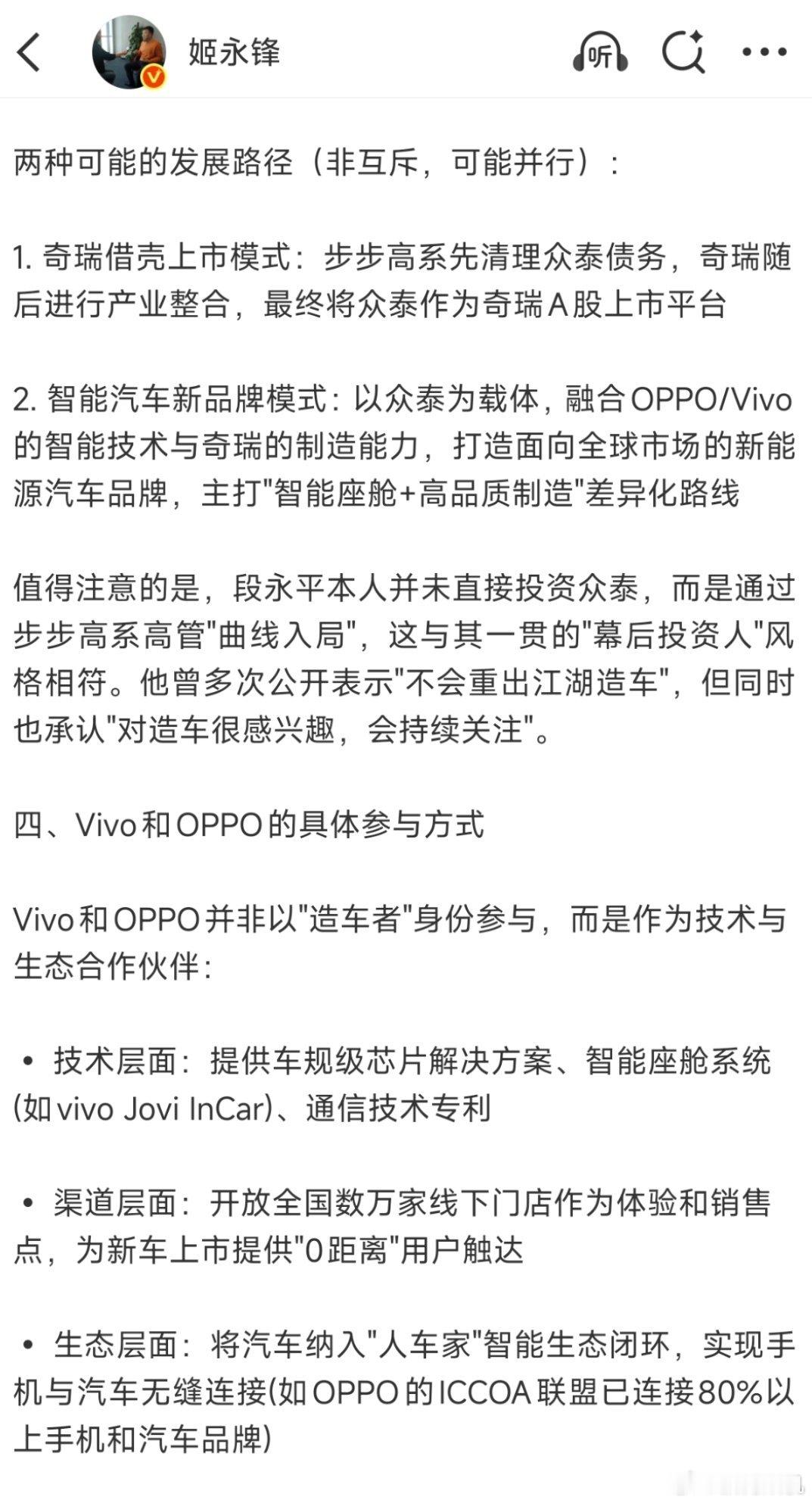 OPPO、 vivo、奇瑞合伙造车,看似强强联合,实际上三方势力进入到一个车企里面,还没开始就已经分成三股绳了。而之前吉利和百度看似也是强强联合,一个造实车,一个负责软件,造出了极越,最后也是一地鸡毛,黯然倒闭。而奇瑞以后还得分奇瑞、智界、众泰,平衡起来就更需要艺术了。不过如果能平衡好,能利用好ov国内强大的渠道和奇瑞丰富的出海经验,或许还有可能。