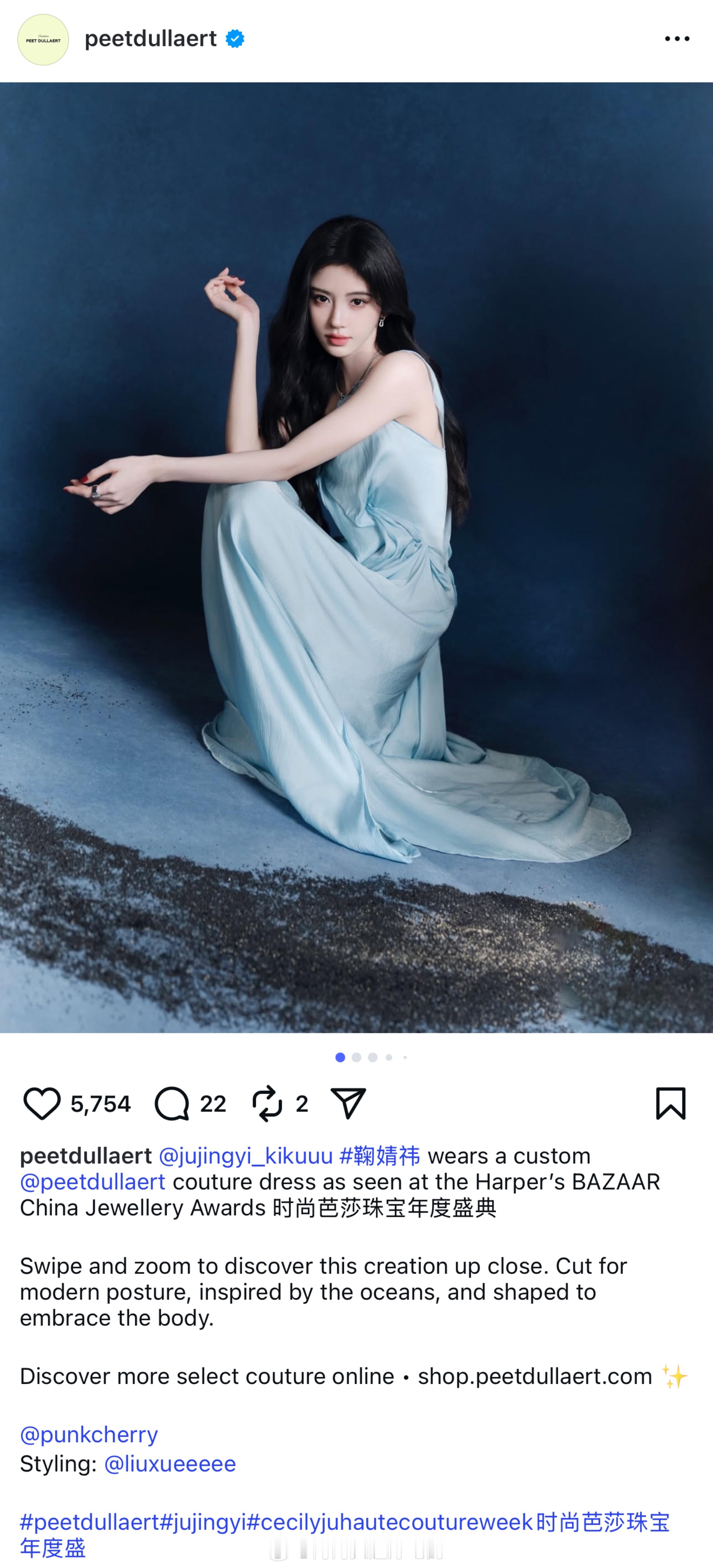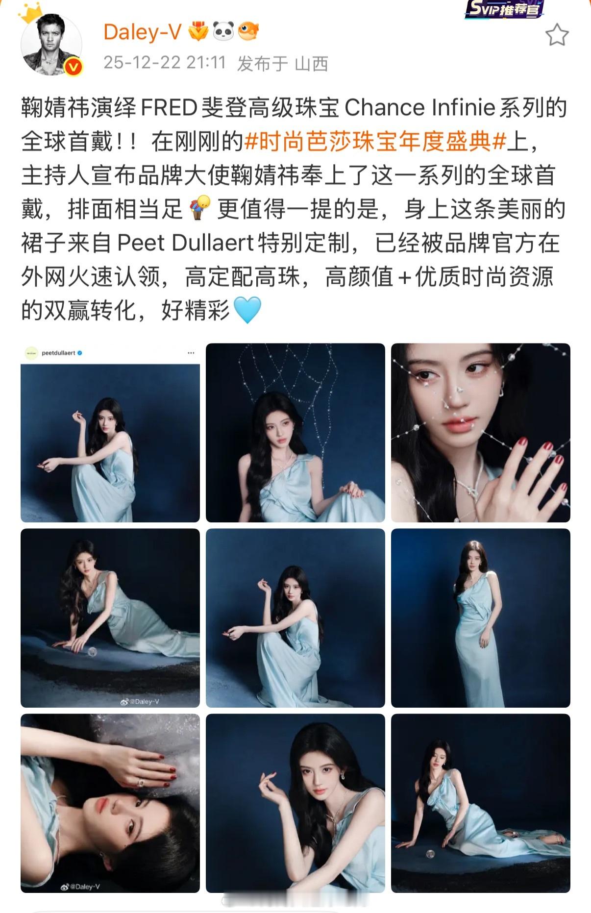 鞠婧祎一克拉冰蓝 出席芭莎晚宴的冰蓝高定长裙被外网品牌方认证,fred珠宝也是全球首戴,鞠婧祎在时尚表现力这一块,完全优等生来的! 鞠婧祎 我的矜贵大小姐