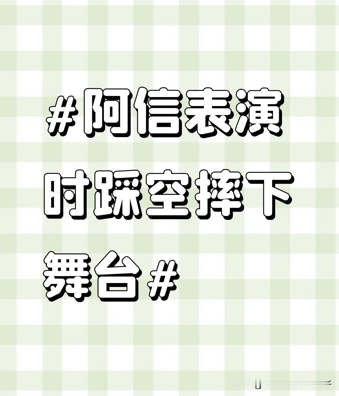 阿信表演时踩空摔下舞台 12月22日“F✦FOREVER 恒星之城巡回演唱会 - 上海站”出状况啦!五月天阿信表演时不慎踩空摔下舞台。当时F4成员言承旭、周渝民、吴建豪都在,吴建豪第一时间冲了过去。回到舞台的阿信用袖子遮住伤口继续表演,太敬业了。 随后阿信经纪公司相信音乐报平安,说他目前状况良好,演出结束会有专业医护人员详细检查。这场演唱会阿信身兼音乐制作和总策划,从舞台到内容都亲力亲为。19号言承旭还夸阿信帮大家实现愿望。希望阿信没啥大碍,继续带来精彩演出!