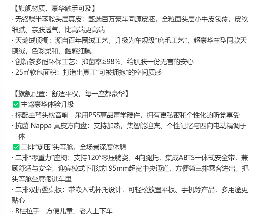 零跑D19 虽迟但到,没有跳票~零跑D19内饰官图来了,设计和用料和现在的零跑差别挺大,明显更高端,但还是走的居家路线,零重力座椅、后排多媒体屏幕、小桌板、木纹饰装饰板啥的都有,核心配置帮大家截了一张图,看的更清晰,这次公开的是6座车型,还有7座可以选,第二排和第三排都能放到纯平。车长5.2米,两种动力形式,80.3度电的增程和115度电的纯电,再加上公布的这些配置信息,您觉得D19价格会定到多少更合适?