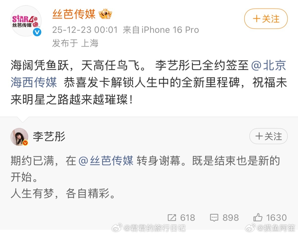 李艺彤发微博宣布和丝芭解约,丝芭也转发微博祝福,和平分手啊