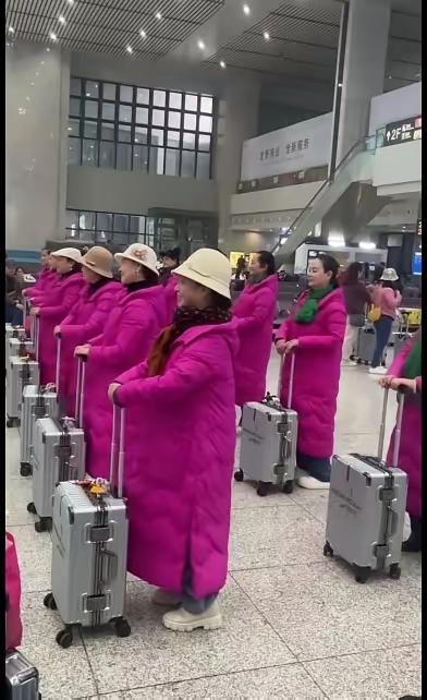 一群老帮菜,城市大妈又来作妖! 以为自己是风景,结果却是奇葩! 近日一群穿着统一紫红色羽绒服,戴着浅白色帽子,拉着统一拉杆箱的城市大妈集体出现在高铁站上。 看这架势这群大妈又是集体出去旅游了,这群大妈打扮洋气,应该都是有退休金的,闲来无事! 并且他们还有领头的,一起喊口号,拍视频。 并且乘车的时候这群大妈插队乘车,基本礼仪道德都不遵守,引发周围乘客嗤之以鼻。大妈 广场上老阿姨 大妈服装 无良大妈 缺德大妈 大妈冬装 大妈显些