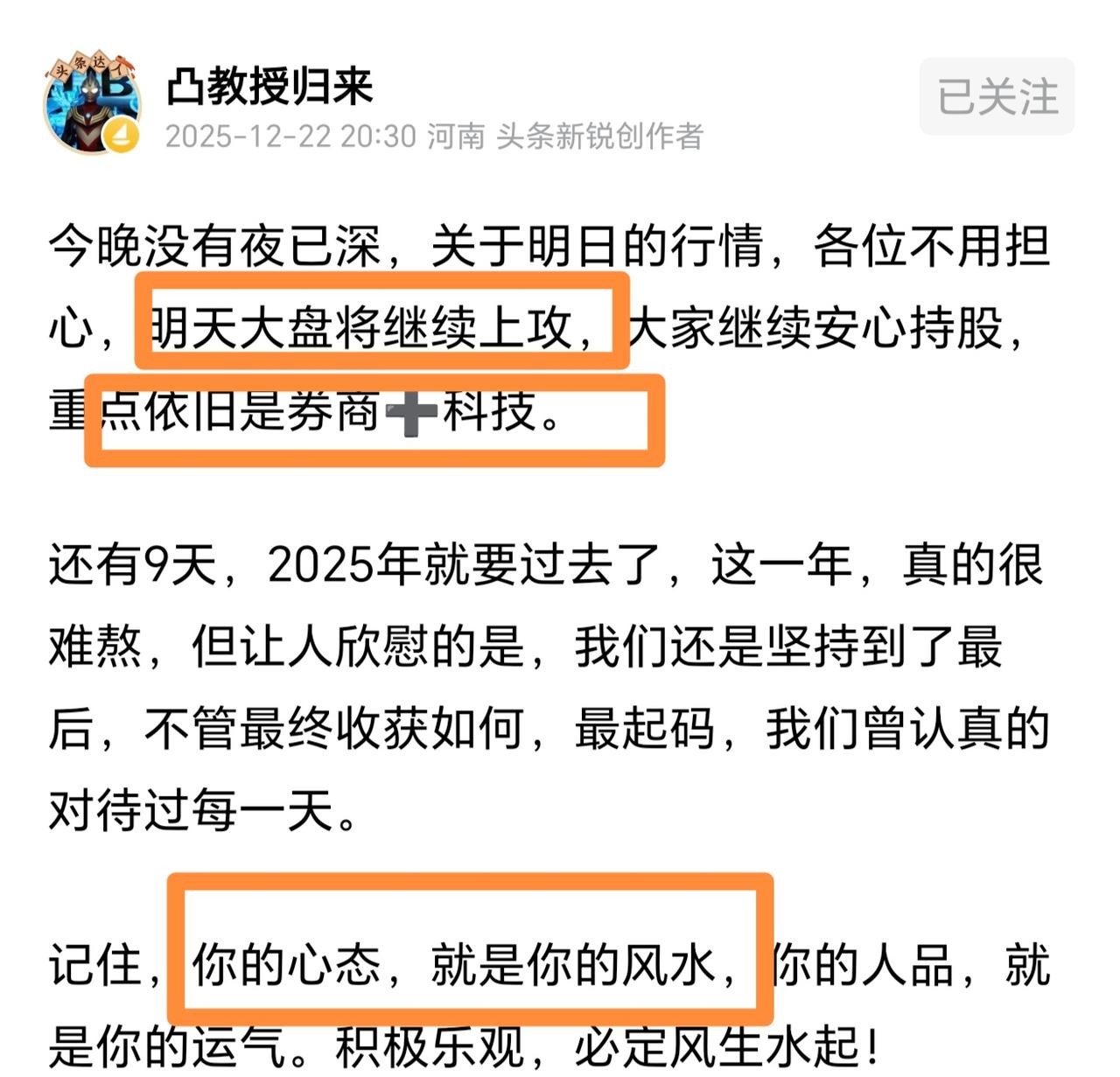 安心持股!凸教授深夜发文,2025年所剩时间不多了,请投资者珍惜宝贵的投资时间。凸教授表示,市场仍然以券商和科技为主线,今天大盘会继续上涨,请投资者把心放在肚子里,心态就是风水,人品就是运气。凸教授依然坚定看好股市,市场即将风生水起,请投资者耐心等待反弹!