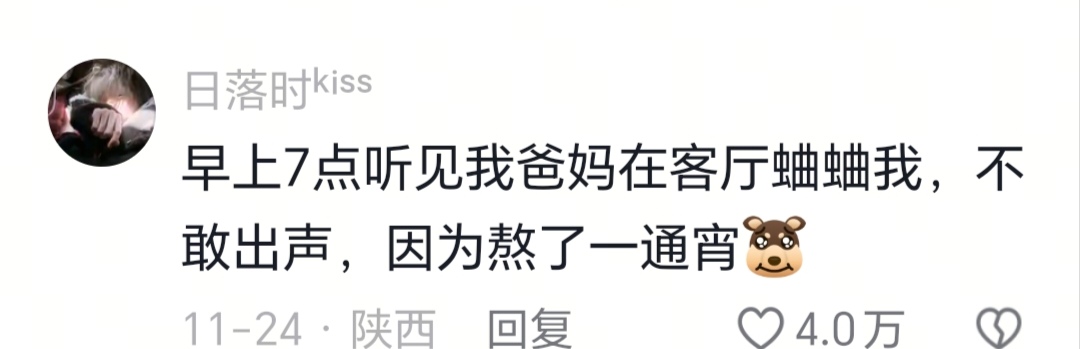 早上7点听见我爸妈在客厅蛐蛐我,不敢出声,因为熬了一通宵