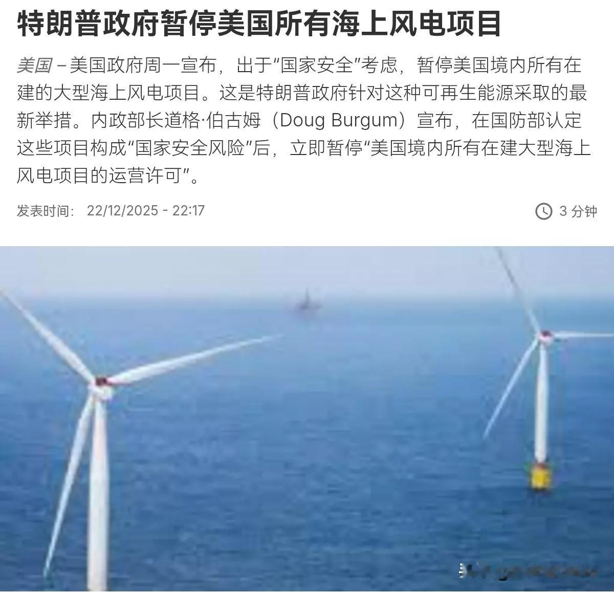 美国签署的这一政令,我们看着都能够笑醒!美国这是又“帮了”我们一把!12月23日,根据法新社报道,美国政府周一宣布,出于“国家安全”考虑,暂停美国境内所有在建的大型海上风电项目。美国内政部长道格·伯古姆称,在国防部认定这些项目构成“国家安全风险”后,立即暂停“美国境内所有在建大型海上风电项目的运营许可”。 伯古姆表示,这些风险据称与涡轮叶片的运动及其高反射率的塔架有关,这些部件会“造成雷达干扰”。说实话,美国竟然能够以大型海上风电构成国安问题,叫停风能项目,这真是让人忍俊不禁,这对于美国的可再生能源的发展无疑是一个打击。当然,这不是特朗普政府第一次这样做。 此前,特朗普多次声称风电、太阳能是“世纪骗局”,指责其不可靠、成本高、破坏景观、损害农业。特朗普的“大而美”法案就大幅缩短风电,光伏税收抵免窗口期。而在对新能源发展进行打压的同时,特朗普则为美国的化石能源进行松绑。说实话,如果综合特朗普的政策来看,就会出现非常滑稽的一幕。 一面是特朗普希望重振美国的制造业,一面是特朗普打击新能源产业的发展。一面是美国大力鼓励AI的发展,另一面,在美国存在巨大的电力缺口的情况下,对于发电产业,美国却不大力度扶持。在我们看来,特朗普的政府这是典型的头痛医头,脚痛医脚。而往大的方面来说,美国似乎已经决定自动退出新能源产业与我们的竞争了,这对于我们不能不说是一个好消息。