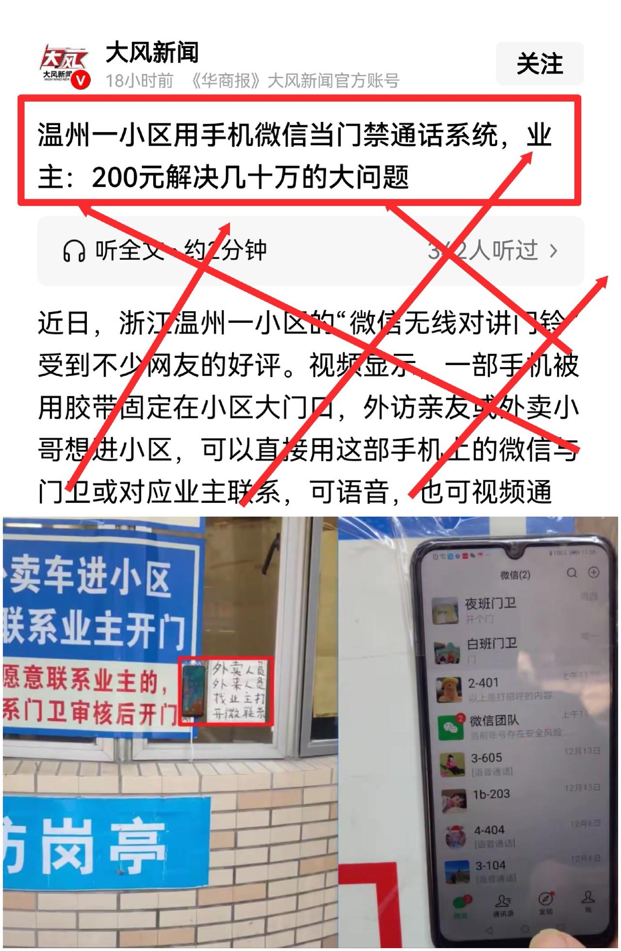 温州一个老小区,最近火了! 火得特别接地气——他们用一部旧手机,一卷胶带,一个全国人民都在用的微信,愣是解决了困扰很多小区的“门禁大难题”。整套下来,花了不到两百块。而按照常规操作,装个呼叫系统,得花几十万。 这事的精髓,就俩字:通透。 先说说咋回事。温州百合苑小区,是个老小区,物业费一平米才四毛钱。小区想装个门禁对讲系统,让外卖、朋友来了能方便联系上业主。一问价,傻眼了,好几万甚至几十万。这对一个业委会自己管、精打细算过日子的老小区来说,压力太大。 咋办?等、靠、要?不。业委会里有高人,灵光一闪:干嘛非要把简单的事情复杂化? 门禁对讲的本质是什么?不就是门外的人能和门里的人说上话,门里的人确认后能开门吗?那现在什么工具最能无缝完成“对话+确认”这件事? 微信啊! 思路一通,豁然开朗。业委会韩先生贡献出一部旧手机,市场价也就一二百块。用胶带把它稳稳当当地固定在大门边。手机上登录着一个专门的微信,小区里的业主们都加了这个微信好友。外卖小哥、亲戚朋友到了门口,点开微信,一键就能语音或视频呼叫要找的业主。业主在自己家里、在单位,哪怕在出差,手机一接,看到来人是谁,说句话确认身份,远程就能点一下手机开锁。 看,流程全通了! 没增加任何新设备,没让业主多下一个APP,用的全是大家闭着眼睛都会的操作。安全吗?业主可以设置不让这个“门卫微信”看朋友圈,隐私无忧。方便吗?太方便了,连门卫大爷都直夸:“这个创意好!” 网友看了直呼“人才”,说“一千多解决了好几万的工程”。要我说,这评价还保守了。它牛在哪? 第一,它是对“技术臃肿症”的一记漂亮反击。 现在很多所谓“智慧社区”方案,喜欢堆料,搞得很高大上、很复杂、很昂贵,仿佛不这样就不叫升级。但这个小区的做法告诉我们:真正的智慧,是直击核心,化繁为简。 就像你要钉个钉子,顺手拿起手边的锤子就行,没必要非得启动一台智能打桩机。微信就是这个“手边的锤子”,它本身已经强大到足以承担这个任务。 第二,这是“群众智慧”的生动体现。 方案不是来自某个科技公司,而是来自小区里自己管事的业委会。他们最清楚自己的痛点(缺钱、要实用),也最了解自己的资源(人人用微信)。这种从实际生活里长出来的解决方案,比任何凭空设计的系统都更具生命力,更“贴肉”。 第三,它完成了一次完美的“资源重组”。 它没有创造新东西,而是把现有的、普及度最高的东西(智能手机、微信、小区业主群),用一種巧妙的逻辑重新组合了一下,就诞生了新功能。这背后是一种举重若轻的创新思维。 当然,它可能不完美。比如手机怕风吹日晒,比如长期看可能需要更稳固的安装方式。但这些都不妨碍它的启示意义:在追求高科技、大投入之前,我们是不是可以先问问自己,有没有更轻巧、更聪明的路可以走? 这件事最动人的地方,就在于那种 “自己动手,丰衣足食” 的劲儿。不抱怨条件差,不坐等救世主,而是基于现实,动用常识,盘活手头资源,把问题给解决了。而且解决得如此漂亮,如此优雅。 这给我们所有人都上了一课:有时候,破局的关键,不在于是不是用了最尖端的技术,而在于有没有打破思维定式的勇气。 一部旧手机+微信,组合出的不只是省下几十万的门禁,更是一种可贵的问题解决之道——简单,直接,有效。 为这种来自生活的、热气腾腾的智慧,点赞!