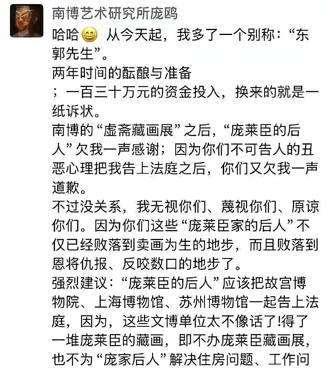 南京博物馆的庞鸥,也是一个关键人。 在庞家捐赠文物后,在南京博物馆工作的庞鸥,写了很多文章的,有书序,也有展册介绍,更有单篇文章的介绍。 冒充庞家后人的徐莺,也是他介绍给庞家的。 没有对这些文物的详细了解,写不出书序,也写不出展册。没有对庞家的详细了解,也写不出庞家的情况。 你说他是不是了解详情的一个关键人?南京博物院 南京国家文物 南京博物馆印章 博物南京 庞家捐赠文物 南京博物馆拍卖 金陵博物院