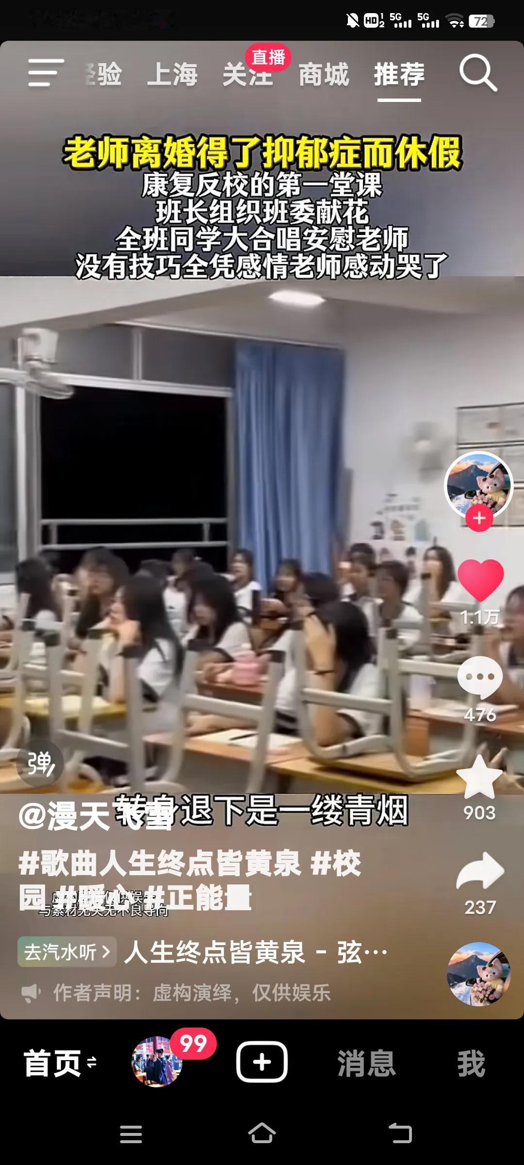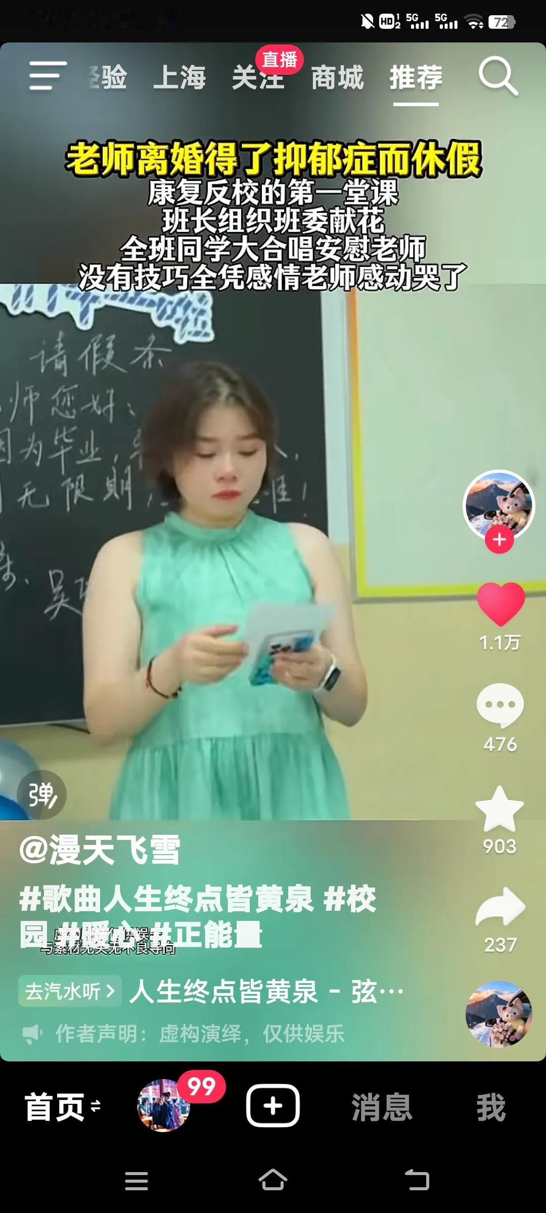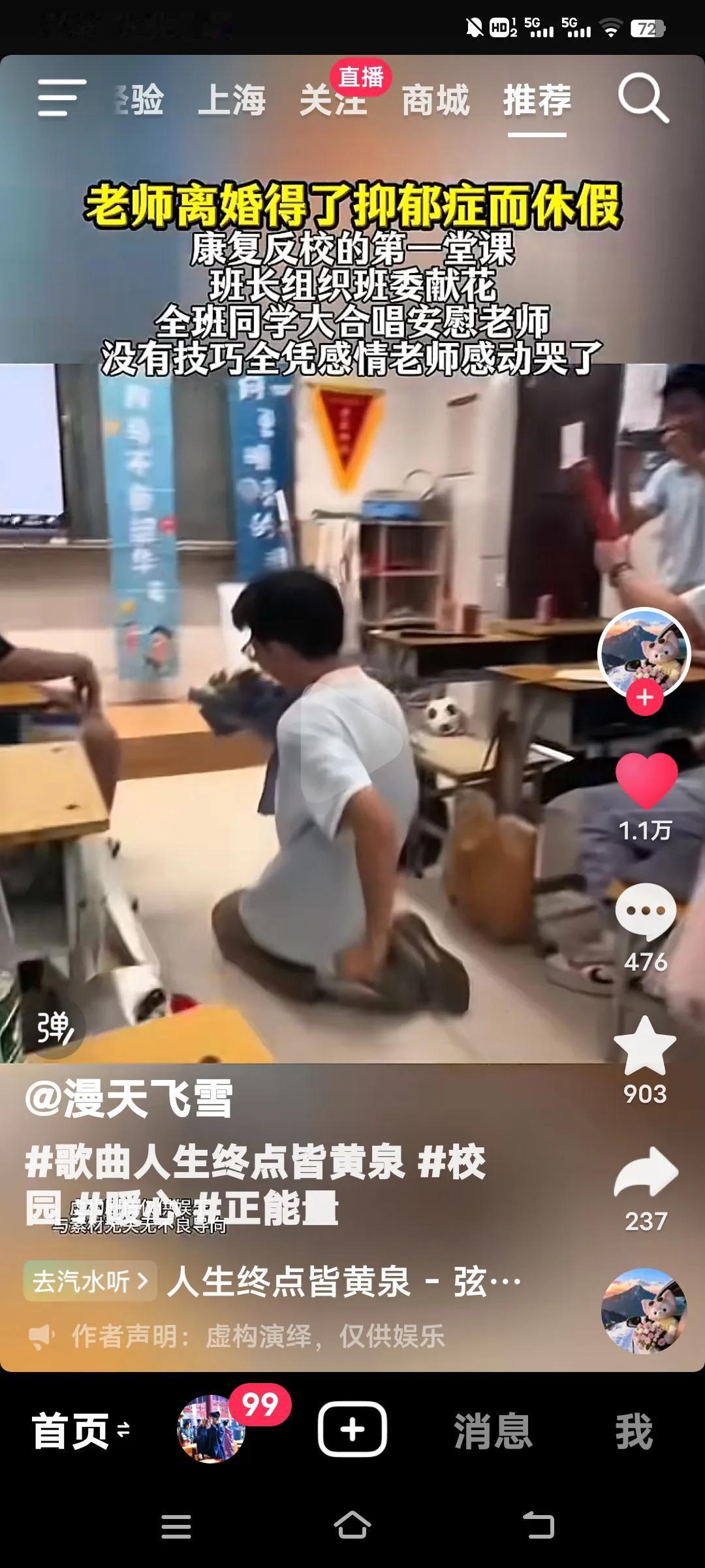 哇哦,这事儿可真把我暖到啦!某职校有位班主任,因离婚患上了抑郁症,休假后重返校园。学生们得知情况后,班长率先行动。全班同学一同合唱《背着风流泪》,那和声格外动人,还献上了鲜花。班主任当场就被感动得热泪盈眶。 在这个充满压力的社会中,这样的场景着实治愈人心。学生们以自己的方式,给老师送去温暖与力量。这可不只是一场合唱,更是一份深厚的师生情,让我们瞧见了人性中最为美好的一面。祝愿老师能早日康复,继续和学生们共度更多美好时光。 评论区有网友说,这么漂亮的老师平日里对学生肯定很好,才培养出如此优秀的学生。没错,这些学生真是太懂事啦。再者,这位美丽的老师离婚说不定并非坏事,肯定有更合适的人在前方等她,或许这就是“无福的赶着有福的”,加油呀,忘掉过去,期待未来! 语文老师的悲伤 抑郁症教师 老师失恋
