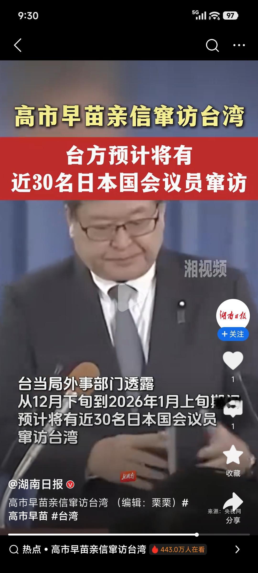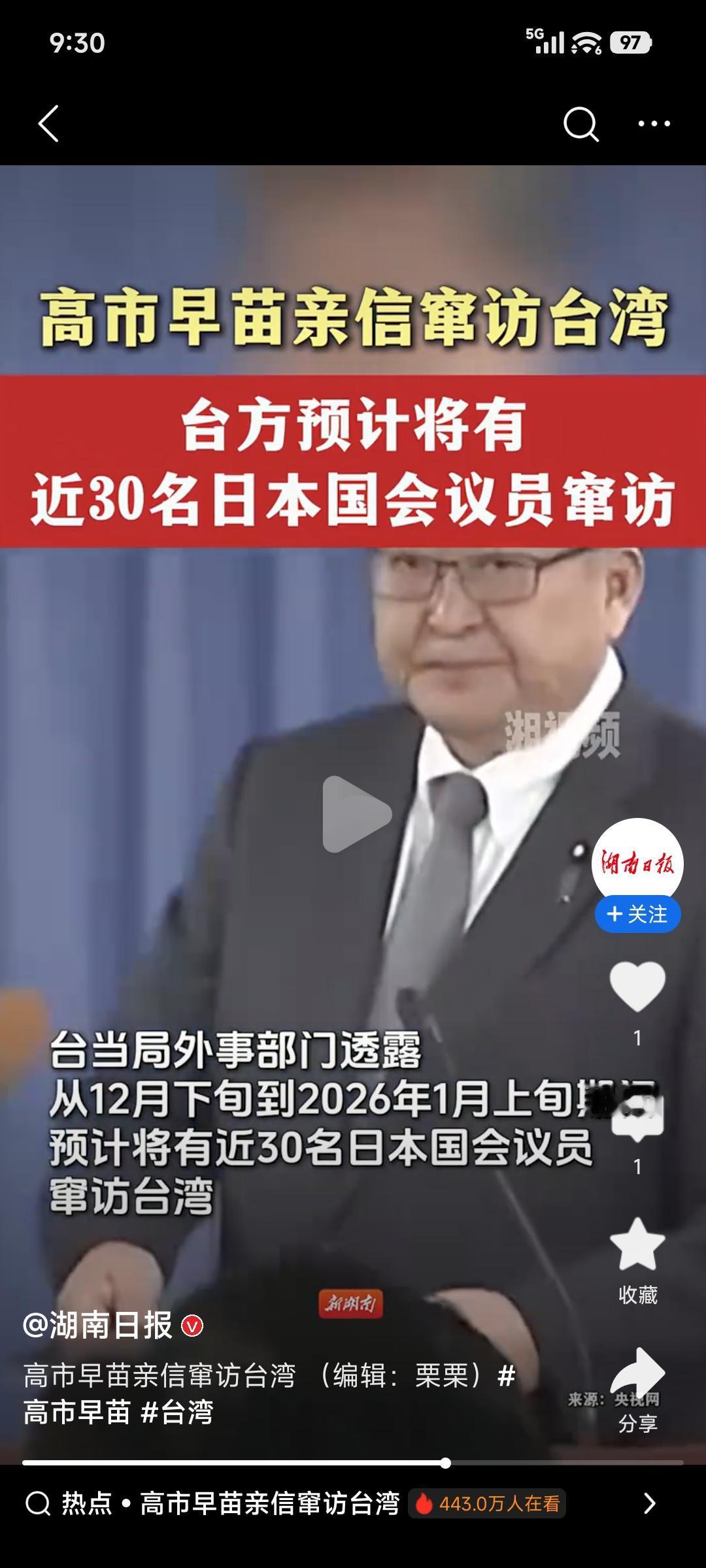 高市早苗亲信窜访台湾,这完全是在挑衅一个中国原则,是对中国主权和领土完整的严重侵犯。 眼下台湾内部,民众党发起弹劾赖清德的网络连署,超600万人支持,远超赖清德当选票数。赖清德一系列不顾台湾稳定、只顾恶斗的行为,已让民众怨声载道。而此时日本自民党干事长代行萩生田光一等约三十名议员窜访台湾,还谈所谓“吕宋经济走廊”,打着经济幌子搞地缘布局。萩生田作为高市早苗亲信,他的窜访更像是在试探大陆底线,把“言论试水”变成“行动试水”。这种行径必将遭到坚决回击,任何企图分裂中国的人都将自食恶果。