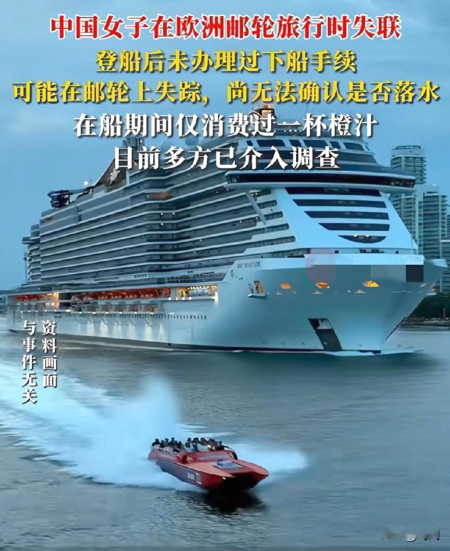 女子乘欧洲游轮旅行失联! 手机关机!未有下船记录! 其母亲表示:女儿在船上只喝过一杯橙汁,是独自一人参加欧洲地中海航线旅行的,12月21日出发,现在失联已经超过一周,女儿房间门窗是关上的,窗帘是拉上的,我要办签证,去当地找女儿,目前多方已介入调查! 以前年轻时候,有个男生追我时说带我去游轮旅游七天,我说不行我妈算命让我离水远点,其实我是怕他在船上绑架我,再给我扔海里!这女孩一礼拜失联了,也没收到任何敲诈勒索电话,希望你平安吧! 国外邮轮是人口贩卖重灾区 因为大部分时间都在公海,有的邮轮游玩时间比较长,没有配备卫星通信和WiFi服务就可能会没信号,无法联络就跟失踪了一样 奉劝各位出门旅行最好不要一个人,不稳定因素太多了,你觉得中国安全,国外就不一定了… 人们只看到了世界美好的一面,不知道世道的险恶,一个小决定,一个头脑发热,往往就会付出生命的代价…