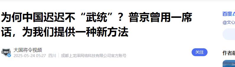 中国为何还不收复台湾,普京的一句话,得到了全体中国人民的认同! 2021年,普京在一次访谈中提到,中国大陆要实现统一,根本不需要动用武力。当时很多人觉得这只是一句外交客套,但结合这两年的全球局势再看,这句话的分量越来越重。 历史上,大陆确实有过几次由于现实条件受限而搁置的行动。早期是跨海装备跟不上,后来是朝鲜战争爆发,导致国际风向剧变。 即便是1958年那场著名的金门炮战,打的也是“政治炮”。炮弹落在无人阵地,既宣示了主权,又巧妙地让外部势力想把两岸彻底隔开的企图落了空。 现代战争的代价,乌克兰已经给全世界算了一笔账。对于一个大国来说,拿回土地固然重要,但拿回来之后如何治理,以及如何保住自己在全球贸易链条中的位置,是更现实的考题。 普京其实看得很透,一个国家拥有庞大的经济体量时,通过摧毁来实现统治,是最不划算的买卖。 再看岛内现状,原本看似稳固的政治格局正在从内部瓦解。党派之间为了选票互相攻击,派系内部则为了利益互拆台脚。这种无休止的内耗,让那些所谓的口号在柴米油盐面前变得越来越苍白。 至于那些所谓的“外部援军”,也各怀鬼胎。美国在台湾问题上的逻辑很清晰,用最小的风险换最大的利润。 他们通过高价卖武器掏空台湾的财政,想让台湾发挥“耗材”的作用去拖住对手,但底线是自己绝不直接下场。 日本则有自己的小算盘,部分政客想借着台海紧张局势为扩充军备找借口。这种各算各账、互相推诿的“盟友”关系,在真正面临危机时,撤离的动作往往比介入更快。 真正让局面发生质变的,是两岸之间已经切断不了的经济引力。在福建平潭,两岸法律制度的对接已经开始落地。 比如,台湾法学专业的学生可以直接在大陆检察院实习、翻看卷宗。这种实打实的制度融合,比任何口号都有说服力。 数据更能说明问题,台湾超过40%的出口额依赖大陆。这种经济上的高度依存,让任何试图“脱钩”的政治“表演”都显得苍白无力。 同时,中俄之间的战略协作也稳固了外部环境。双方在能源、金融领域的深度合作,让中国在处理台海问题时,拥有了足以对冲外部制裁压力的底气。 普京之所以能看懂中国大陆的耐心,是因为他深知战争的代价。北京现在的策略很明确,不急于一时一刻,而是持续增强综合国力,让冲突的代价大到对方根本无法承受,从而逼迫对方放弃对抗。 对大陆而言,时间确实是最好的朋友。这不仅是在等待一个地理上的结果,更是在构建一个让两岸民众都能感受到尊严与实惠的共同未来。 信息来源:《为何中国迟迟不“武统”?普京曾用一席话,为我们提供一种新方法》,成都网络官方,2025年5月24日。