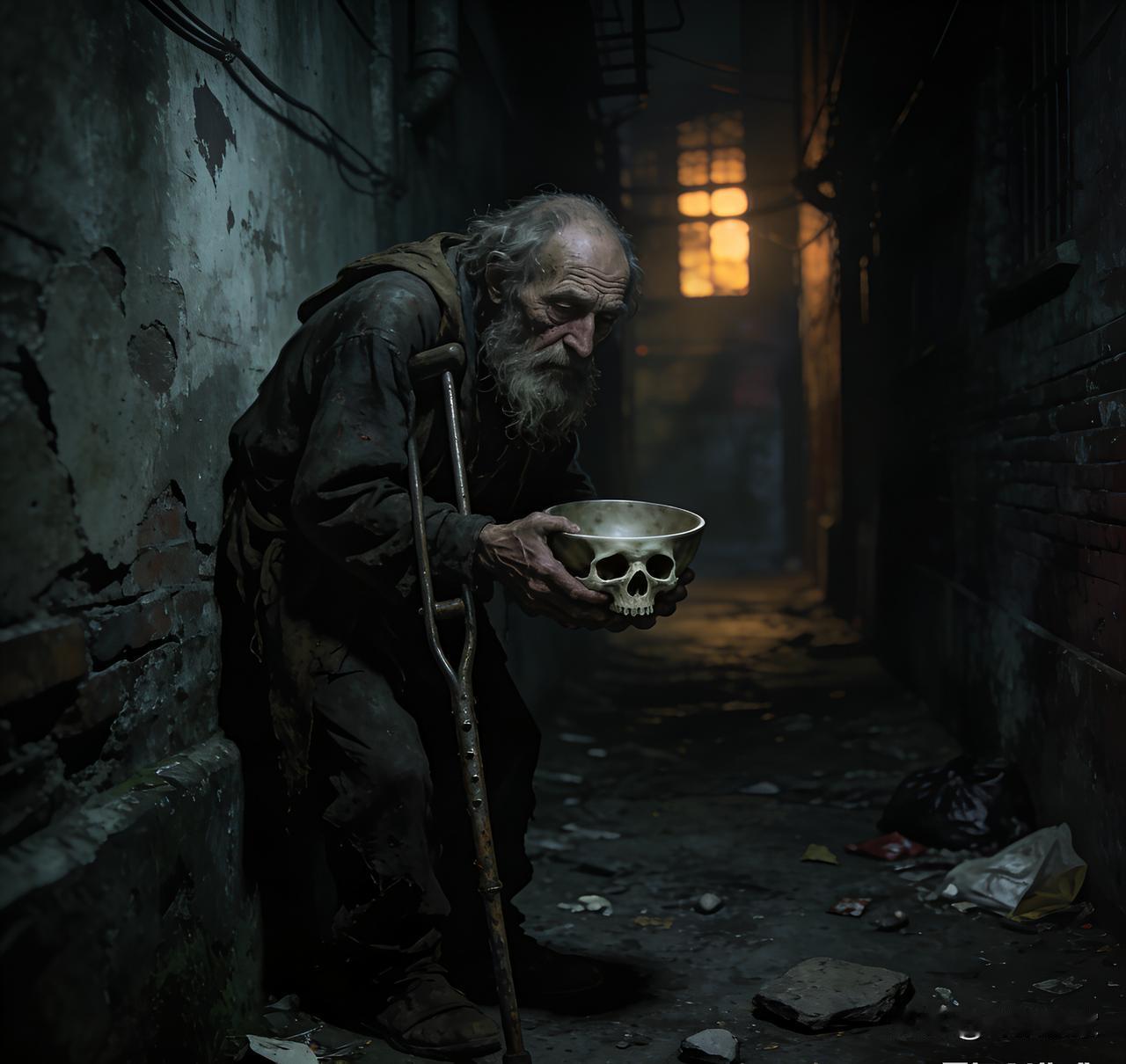 很久以前,有一个很奇怪的乞丐,穿芒鞋,着缁衣,拄着一根拐杖,手里捧着一个钵盂,这钵盂形状很奇特,竟然是人的头盖骨磨制而成。 乞丐叫胡成,原来是大地主人家的仆人。胡成很能干,对地主老爷也很忠心。在胡年二十多岁时,老爷作主,为他娶了一个小媳妇。胡成很感激,做事更加卖力了。胡成和媳妇很恩爱,一年后就生了一个娃。 有一天,胡成从外面干活回来,娃在屋里哭,却不见娃的娘。院子里有人告诉他:“老爷叫她去他屋里了。” “叫她去干什么呀?” 那人欲言又止,摇摇头,叹息一声走开了。 胡成想去老爷屋里,但他不敢,因为没有老爷的允许,仆人是不能随便进屋的。 胡成着急地等啊,等了好久,终于看见媳妇从屋里出来了,脸色红红的,头发凌乱,见到胡成,眼泪就涌出来了。 胡成心都凉了,但他不敢发作,因为触怒了老爷,随时会卷铺盖走了。 胡成和媳妇儿就这么忍着耻辱。这种事又接二连三地发生了。胡成心里很烦,脸色也不好看了。老爷见了,问道:“你摆这副臭脸是给我看的吗?” 胡成没有回答。老爷倒生气了,骂他:“你媳妇是我花钱娶的,你这忘恩负义的贱种!” 胡成眼泪在眼眶里打转,暗暗地攥紧了拳头。 不久,媳妇又怀孕了,胡成说了她一句:“这恐怕不是我的种吧。” 媳妇儿听了这句话,受不了了,当晚就吊死在院子里。胡成很伤心,把媳妇埋在土里。更让他绝望的是,自己的娃生病了,胡成找老爷要钱买药,碰上老爷心情不好而拒绝了。过了几天,娃就死了。 胡成觉得自己活不下去了,躺在屋里不出去干活,老爷便让他滚蛋。 胡成不能再待下去了,临走前,拿砍柴的斧头砍死了老爷,割了头颅带走了。 这就是说胡成讨饭用的人骨钵盂的来历。