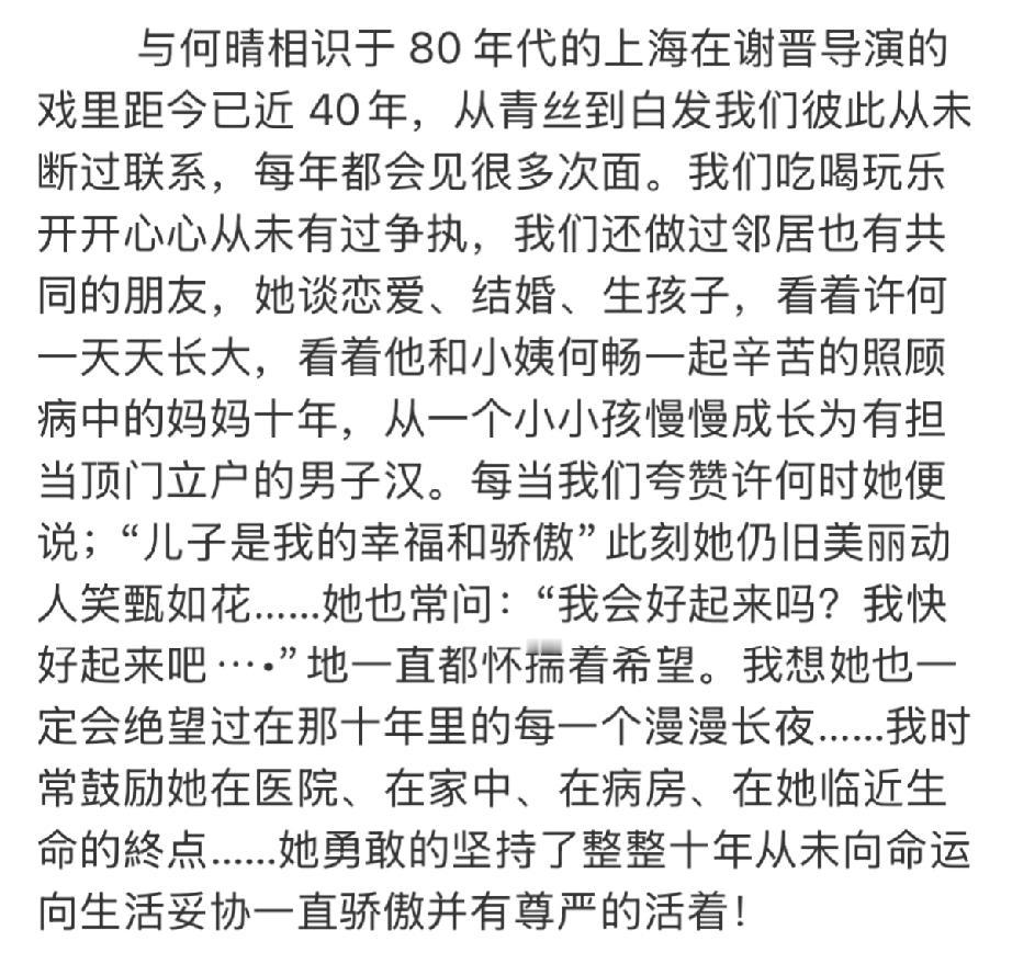 眼含热泪,看完何晴挚友徐松子的追悼文,其中的亲情最感人至深,久久难以释怀! 何晴