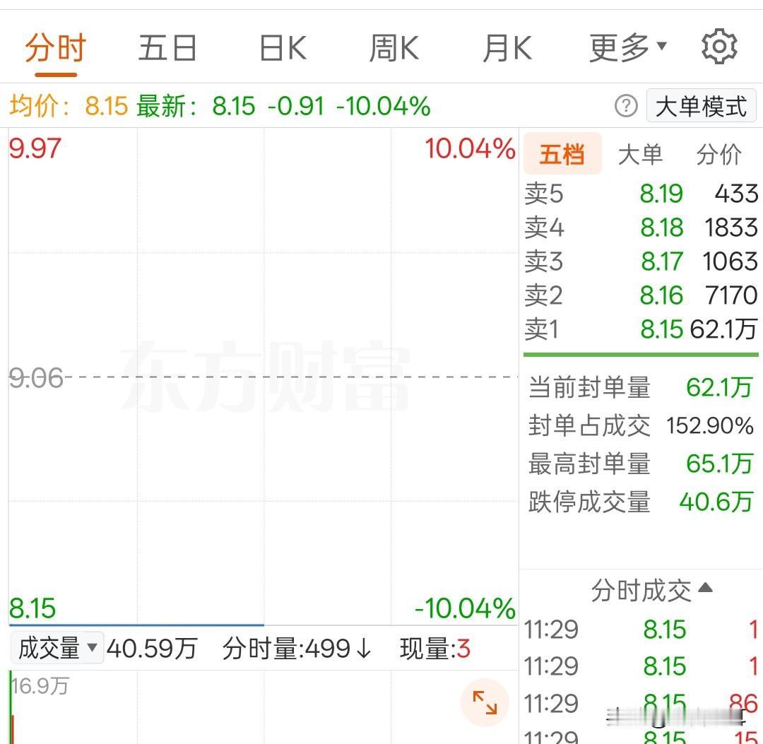 这就是追高的代价,再来两个跌停就回原点了 一部外来的电影,带来短期的翻倍,又快回原点了。恶炒终究得恶果。 想想年初,一部大卖的《哪吒》,虽然翻了几倍,也就一部到位。它只是个这部电影的工具,且在外部环境如此恶劣的情况下,还有人存在着幻想。 两个跌停后,整顾三天,这三天成交量巨大,也是给了散户出逃的机会;然后又来两个跌停。今天封板62万手,按照这个趋势,再来两个开板,就算主力仁慈了。它回到原点,继续保持震荡是大概率事件。 现在市场环境更加恶劣了,如果遇到突发事件,导致股价快速拉升,大家千万三思而后行,有些钱不是那么好挣得。比如前期的雅下炒作,他们套牢了多少人。