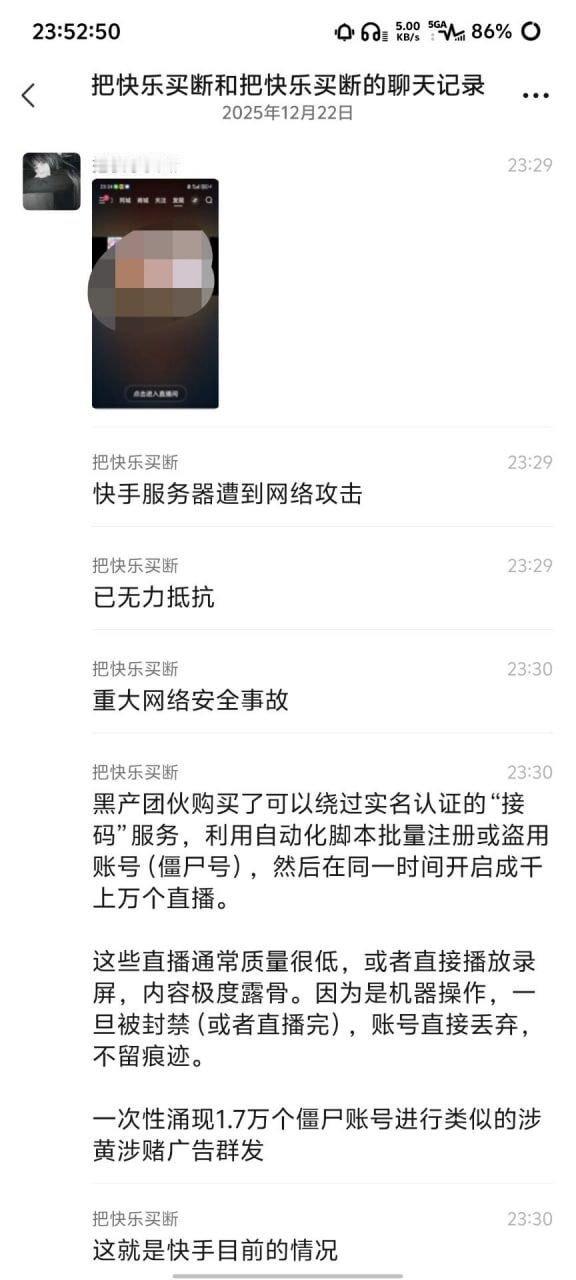 昨天晚上的快手出现重大事故了,竟然很多账号集体直播某颜色视频,而且有的直播账号约1个小时才被处理封禁(还是直接全部关闭了直播功能),后续快手称是遭到黑灰产攻击,已报警。话说,使用快手的不少都是未成年人,此次快手事件绝对算是重大事故了吧?!另外,作为国内的第二大短视频平台,快手的服务器等竟然那么容易就被黑客攻击沦陷了,而且过了那么长时间才得到解决,这一点让人感到不寒而栗啊……快手称遭到黑灰产攻击烽火问鼎计划热点观点