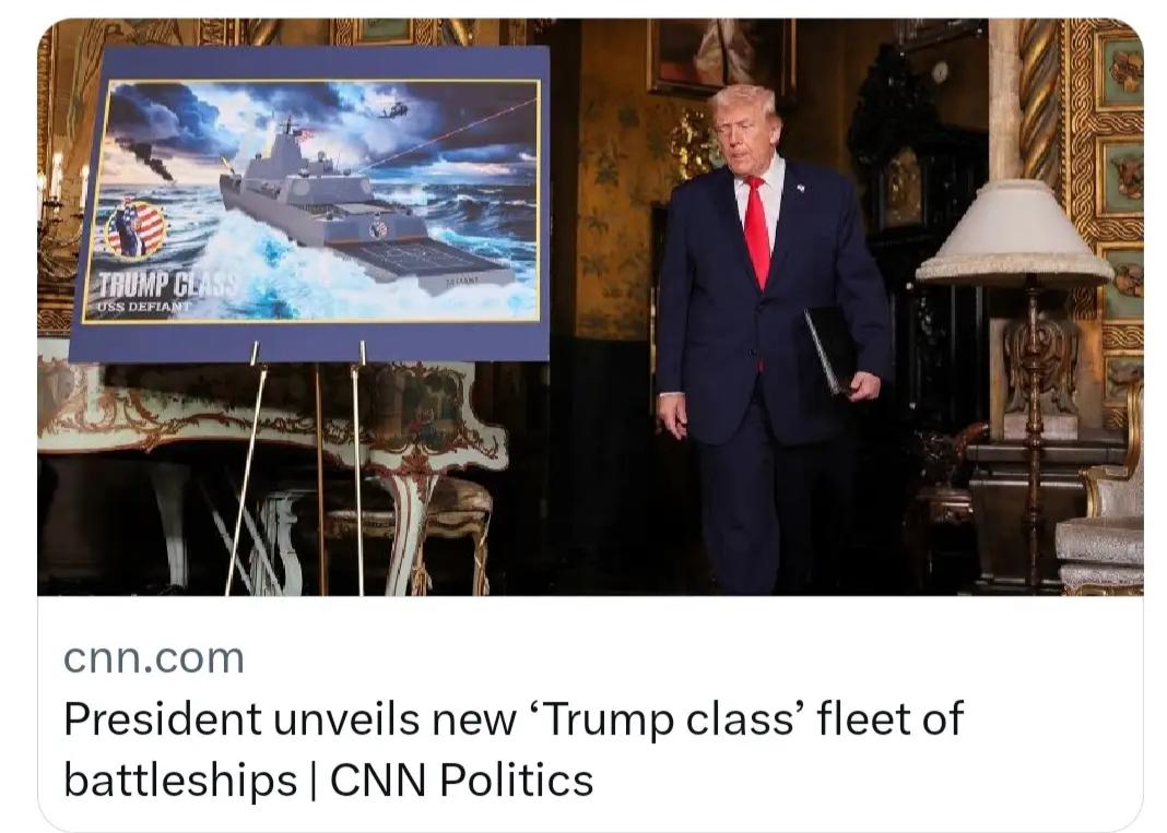 战舰直接冠自己名,特朗普把虚荣心焊在舰船上了! 要说军事装备能玩出花样的得算美国人,能给军舰命名玩出新高度的还得看特朗普。今天,央视新闻报道的消息直接给我看乐了,特朗普在佛罗里达州的海湖庄园,宣布要造美国新型战舰了,结果这战舰级别名字一公布,满屏的滑稽感都快溢出来了。 为啥这么说?因为这批新型战舰不叫别的,直接冠名“特朗普级”,难道美国海军舰队是要变成大型“个人冠名现场”吗?要知道这可不是小物件,是动辄耗费巨资的战舰啊!按照消息里说的,首舰叫“无畏”号,初期先造2艘试试水,之后还要加造8艘,特朗普甚至放话想总共搞出20到25艘,塞进他心心念念的“黄金舰队”里。 这操作真把“好大喜功”四个字写脸上了。"懂王″就是"懂王″,之前他还自称“非常懂造船”,现在看来,懂不懂造船不好说,但懂怎么把虚荣心刻进装备里是真的。这名字能提升战斗力吗?估计悬。海军将士们出海执行任务,念叨着“特朗普级”战舰,怕不是先憋不住笑,哪还有心思专心保家卫国? 与其说这是为美国海军发展添砖加瓦,不如说是给自家名字刷存在感的新套路。毕竟连诺贝尔和平奖提名都能说成“获奖”的人,把战舰冠上自己的名字,好像也没那么意外了。就是不知道这“特朗普级”战舰下水的时候,会不会也像海湖庄园上空那架拉着“HAHAHAHA”横幅的飞机一样,成为大家的快乐源泉?