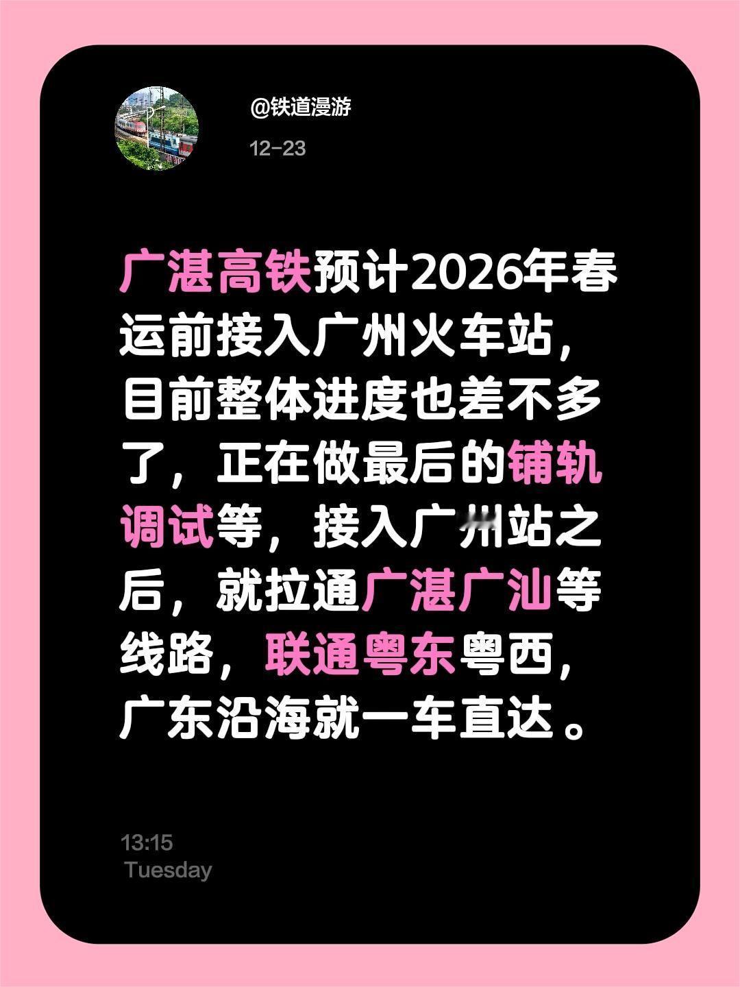 广湛高铁预计2026年春运前接入广州火车站,目前整体进度也差不多了,正在做最后的铺轨调试等,接入广州站之后,就拉通广湛广汕等线路,联通粤东粤西,广东沿海就一车直达。