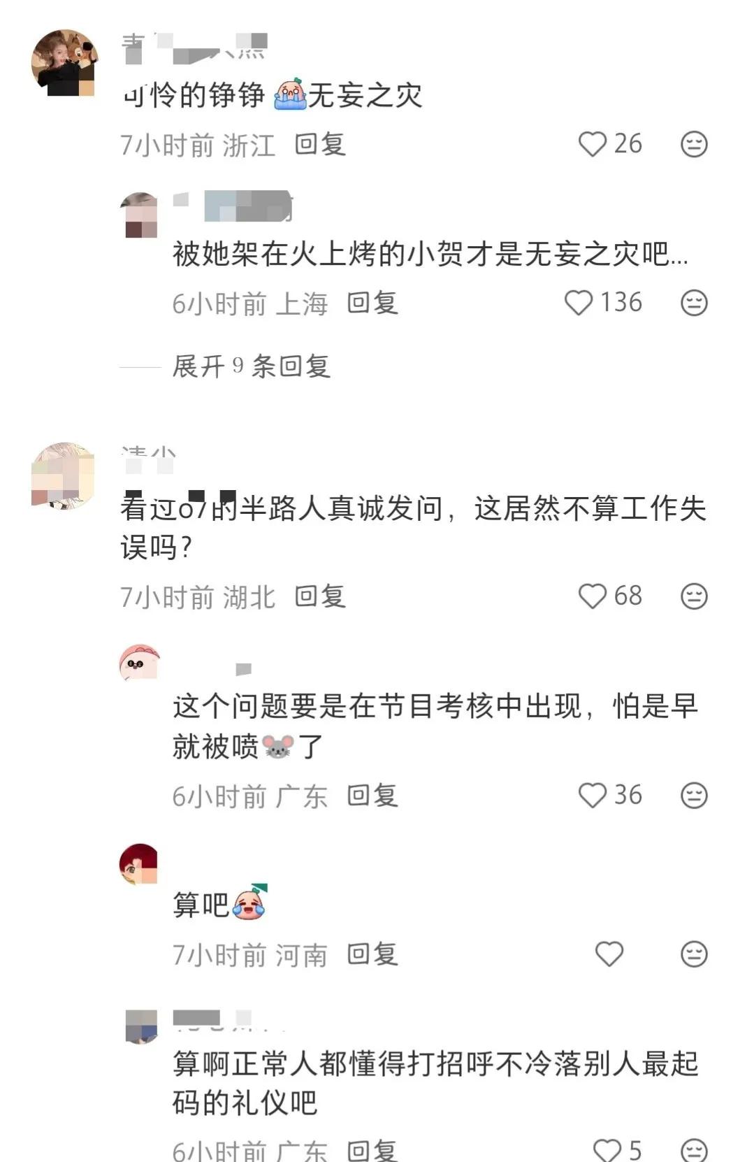 庞铮就主持失误事件向贺峻霖道歉。 看了星光大赏的原视频,网友总结了一下庞铮的问题: 1.打断陈辰老师夸奖她的话,直接去跟下一位说话 2.三位主持人只提到两位,把贺峻霖晾在一边,没有提到名字也没有介绍也没有互动 3.田曦薇和鞠婧祎一起走,但是只提到了田曦薇的名字 4.没有提前做好功课,不知道白鹿新剧要上了 5.抢赵露思手中的话筒,也有可能是想帮忙拿 6.道歉只提到了贺峻霖的大名,其他人为什么不道歉呢 当然也有人体谅庞铮,觉得没必要斤斤计较。或许每个人的感受都不同,没有看这个热.搜之前,那个不打招呼的视频我就看过,看完就滑走了。现在又回去看那个视频,代入评论区提出的质疑,我也觉得有点不妥。 作为普通人,可能在社交场合做到庞铮这样就够了,与有私交的人多寒暄几句,不熟但认识的人可能就笑一下点个头。但是,公众人物尤其是优秀的主持人需要照顾到所有方方面面,毕竟摄像头都盯着你。 庞铮的失误可不止这一个男明星,专业能力有问题,确实应该反省,但这份道歉却针对性极强,怎么现在yxh全引导为贺峻霖粉丝和女主持的纠纷了呢?
