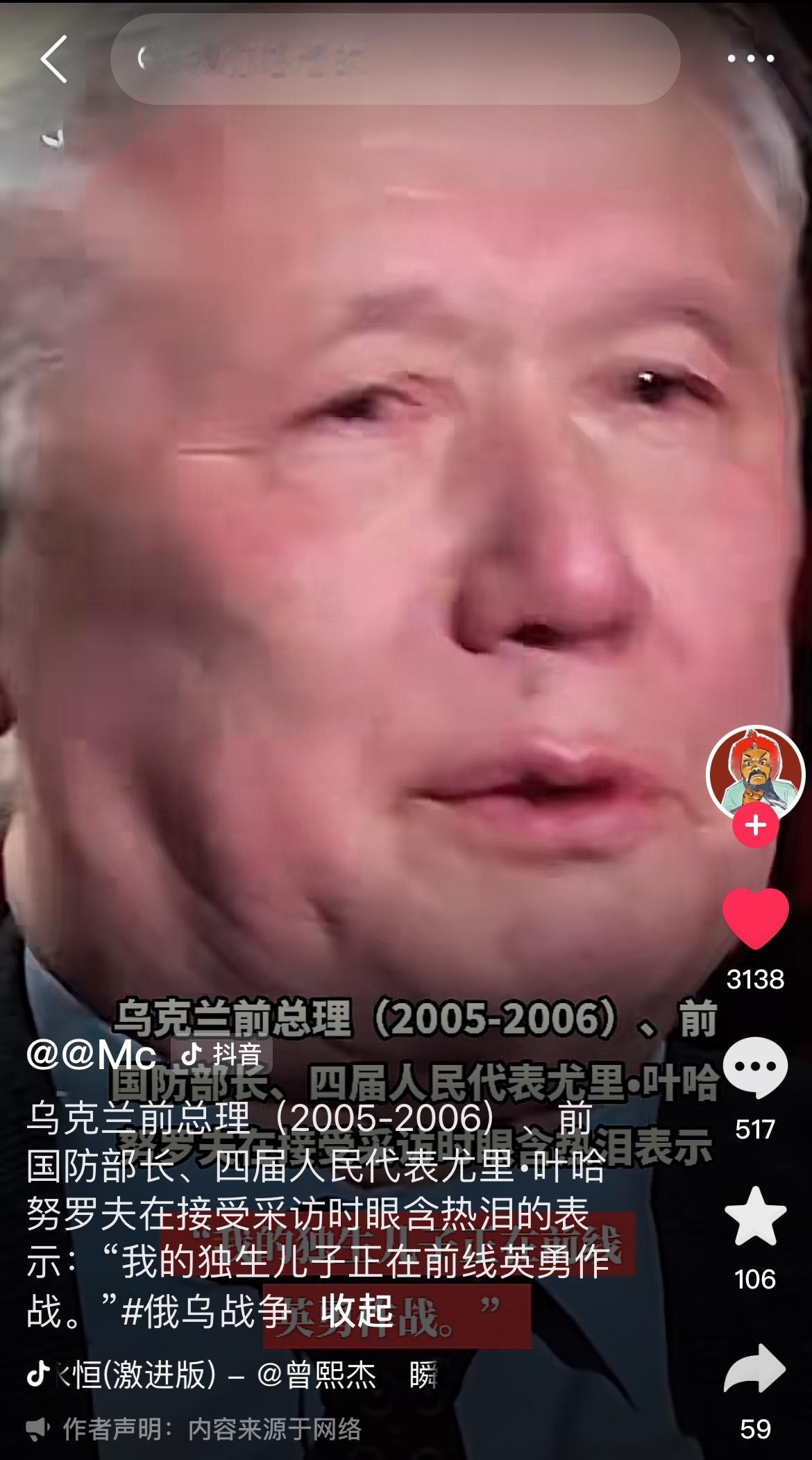 乌克兰前总理、国防部长、四届人民代表叶哈努诺夫接受记者采访时满含热泪,他的独生儿