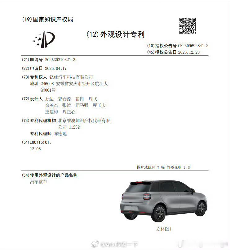 江淮钇为3改款专利图,跟早前被曝光的真车图是一模一样的,这车灯说它是问界M1也不为过,我之前也发过后面两张图,被江淮的人找上了