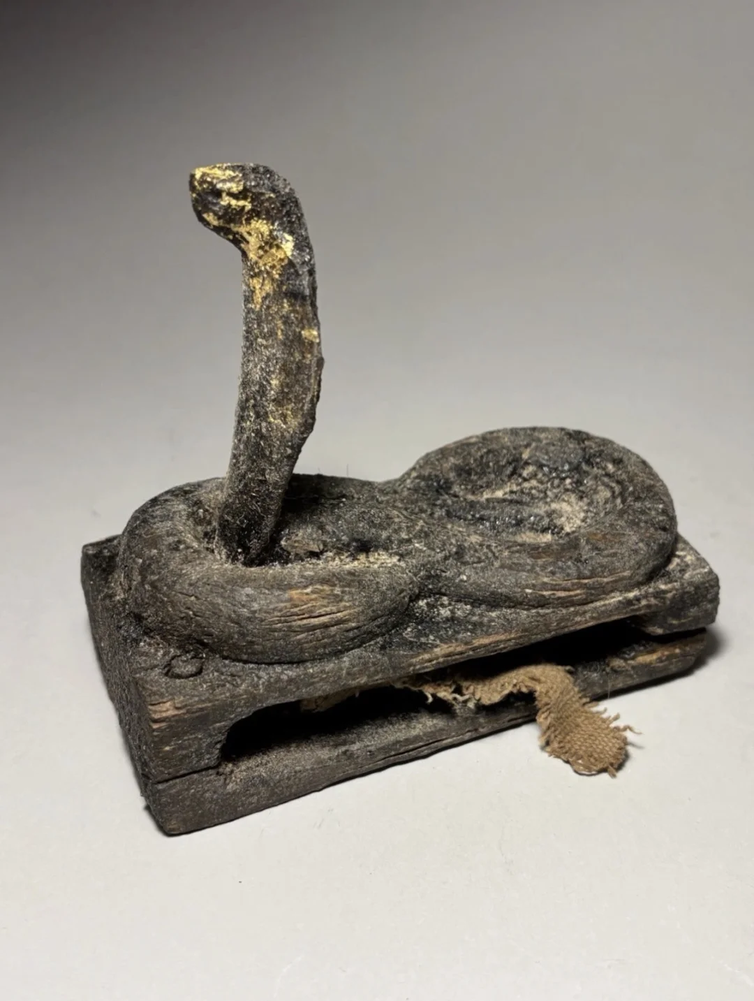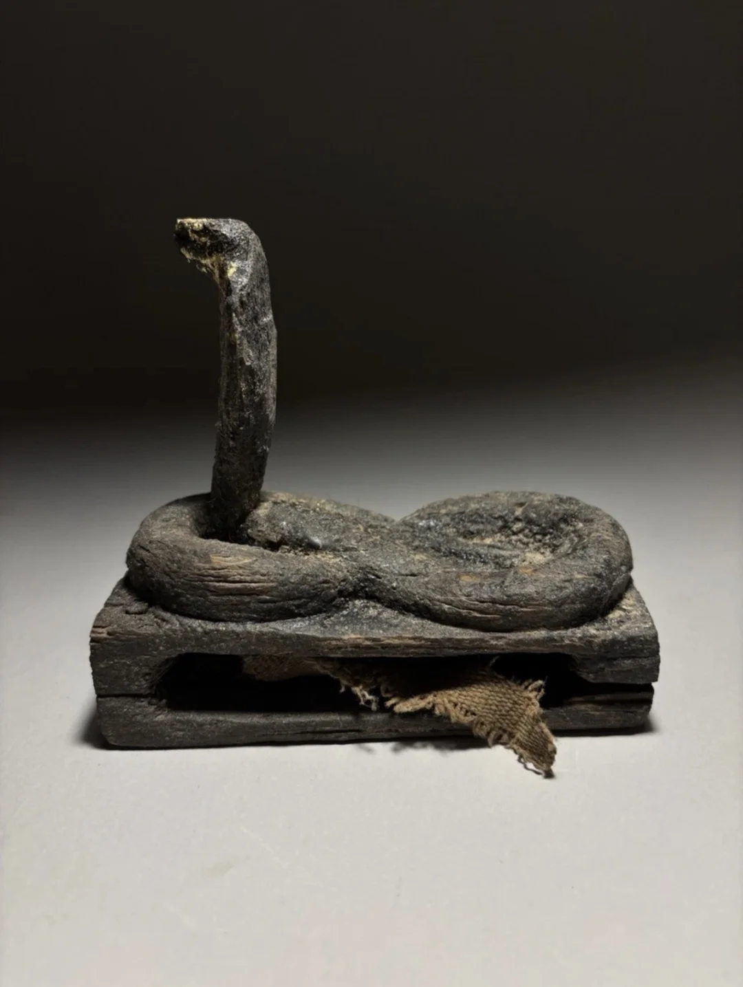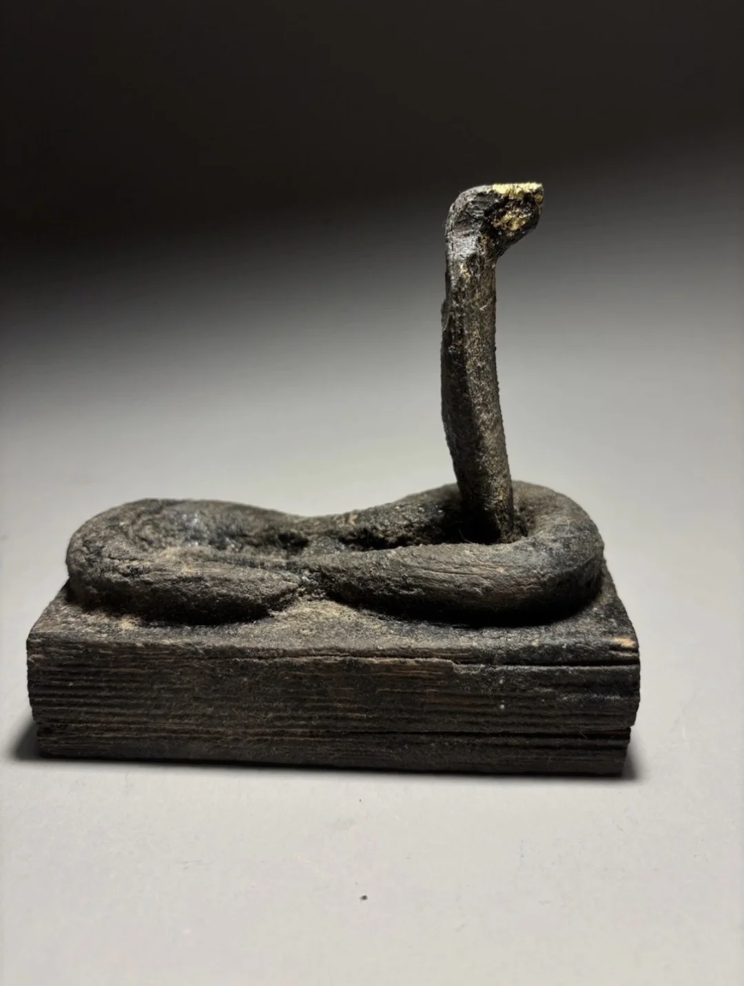 古埃及托勒密时期(公元前305年-公元前30年)的木质蛇类棺材 在古埃及神话中,蛇是强大的保护符。棺材上的蛇(尤指“圣蛇”乌拉乌斯)是下埃及的守护神,象征着法老的权威和对邪恶力量的抵御。在棺材上刻画蛇,旨在驱赶邪灵,为死者提供持续的保护。蛇与“地府”“重生”紧密关联(蛇蜕皮象征复活),黑色棺材强化了与冥神奥西里斯的联系。 棺材盖上雕刻盘绕的立体蛇形,蛇身呈现“8”的符号♾️。表面涂以黑色树脂,象征再生与冥界。黑色代表尼罗河肥沃淤泥(重生之源),也关联冥神奥西里斯与复活之力,局部贴金箔,突出神圣性。艺术风格更自然主义,蛇的形态刻画更生动。 托勒密时期动物崇拜盛行,蛇被视为神祇化身或信徒与神沟通的媒介。埋葬蛇木乃伊旨在取悦神祇,祈求庇佑。动物崇拜商业化,棺材可能批量制作,但蛇棺因象征意义特殊,仍保持较高工艺水平。 通过黑色象征、蛇形塑造及铭文祈祷,这些棺材成为连接现世、神界与冥世的桥梁,体现了古埃及文明末期对永恒生命追求的独特表达。 高度:12cm 长度:12.7cm