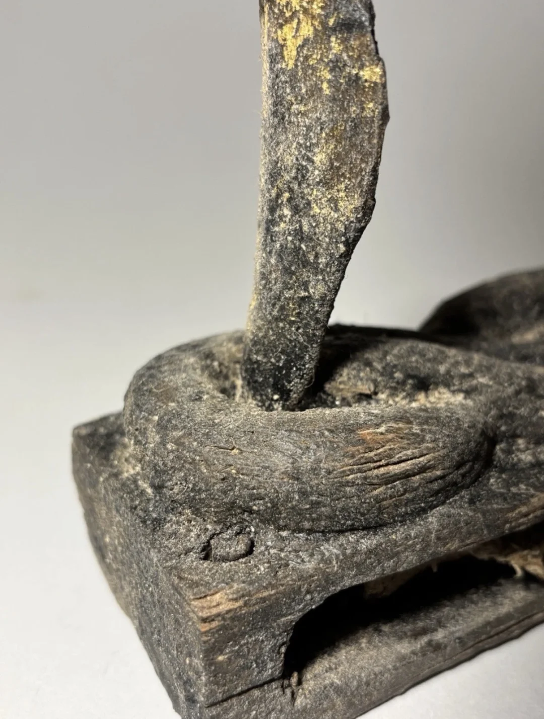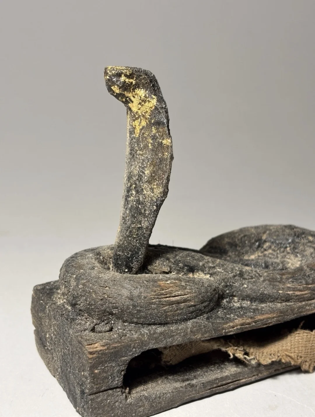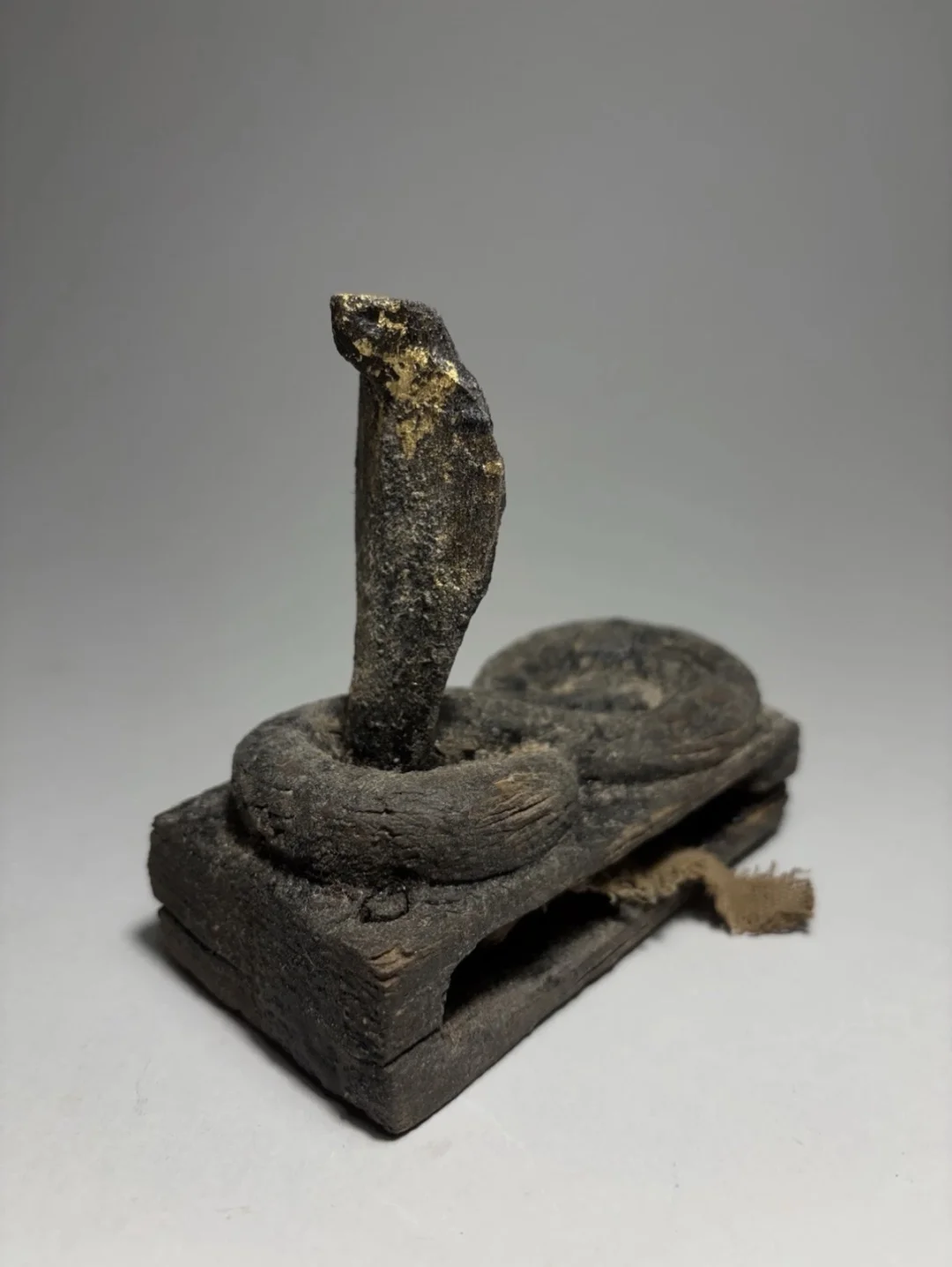 古埃及托勒密时期(公元前305年-公元前30年)的木质蛇类棺材 在古埃及神话中,蛇是强大的保护符。棺材上的蛇(尤指“圣蛇”乌拉乌斯)是下埃及的守护神,象征着法老的权威和对邪恶力量的抵御。在棺材上刻画蛇,旨在驱赶邪灵,为死者提供持续的保护。蛇与“地府”“重生”紧密关联(蛇蜕皮象征复活),黑色棺材强化了与冥神奥西里斯的联系。 棺材盖上雕刻盘绕的立体蛇形,蛇身呈现“8”的符号♾️。表面涂以黑色树脂,象征再生与冥界。黑色代表尼罗河肥沃淤泥(重生之源),也关联冥神奥西里斯与复活之力,局部贴金箔,突出神圣性。艺术风格更自然主义,蛇的形态刻画更生动。 托勒密时期动物崇拜盛行,蛇被视为神祇化身或信徒与神沟通的媒介。埋葬蛇木乃伊旨在取悦神祇,祈求庇佑。动物崇拜商业化,棺材可能批量制作,但蛇棺因象征意义特殊,仍保持较高工艺水平。 通过黑色象征、蛇形塑造及铭文祈祷,这些棺材成为连接现世、神界与冥世的桥梁,体现了古埃及文明末期对永恒生命追求的独特表达。 高度:12cm 长度:12.7cm