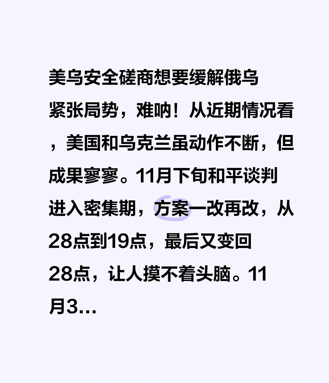 美乌安全磋商想要缓解俄乌紧张局势,难呐!从近期情况看,美国和乌克兰虽动作不断,但成果寥寥。11月下旬和平谈判进入密集期,方案一改再改,从28点到19点,最后又变回28点,让人摸不着头脑。11月30日乌谈判团长还因腐败案辞职,影响后续节奏。 12月美国与乌克兰那场4小时闭门会谈,虽称积极有效,却无实质性进展。核心问题如顿巴斯归属和乌是否加入北约,双方分歧巨大。乌坚守领土底线,不愿让步。在这些关键问题没解决前,美乌安全磋商恐怕只是空谈,缓解紧张局势没那么容易。