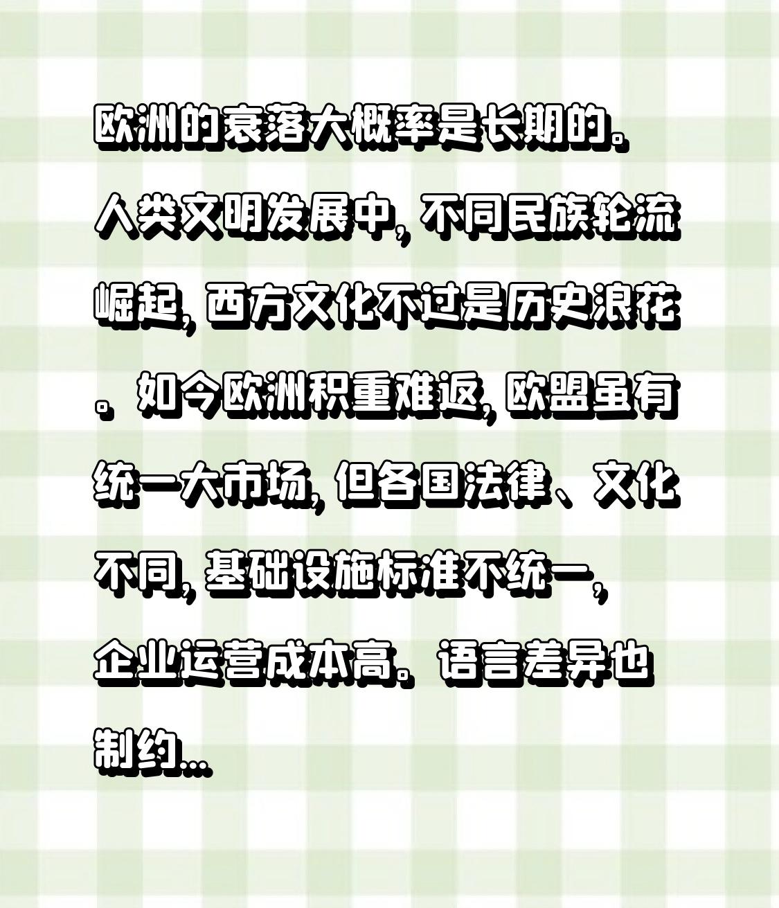 欧洲的衰落大概率是长期的。人类文明发展中,不同民族轮流崛起,西方文化不过是历史浪花。如今欧洲积重难返,欧盟虽有统一大市场,但各国法律、文化不同,基础设施标准不统一,企业运营成本高。语言差异也制约互联网巨头诞生,难以有全球影响力大企业。 能源方面,欧洲无法自给,俄乌冲突引发的能源危机加速制造业外流,像德国电价高涨让很多企业关闭本土工厂。经济数据也不乐观,2024年欧洲GDP增速仅0.8%,德国经济连续两年萎缩。种种迹象表明,欧洲衰落难以在短期内扭转。