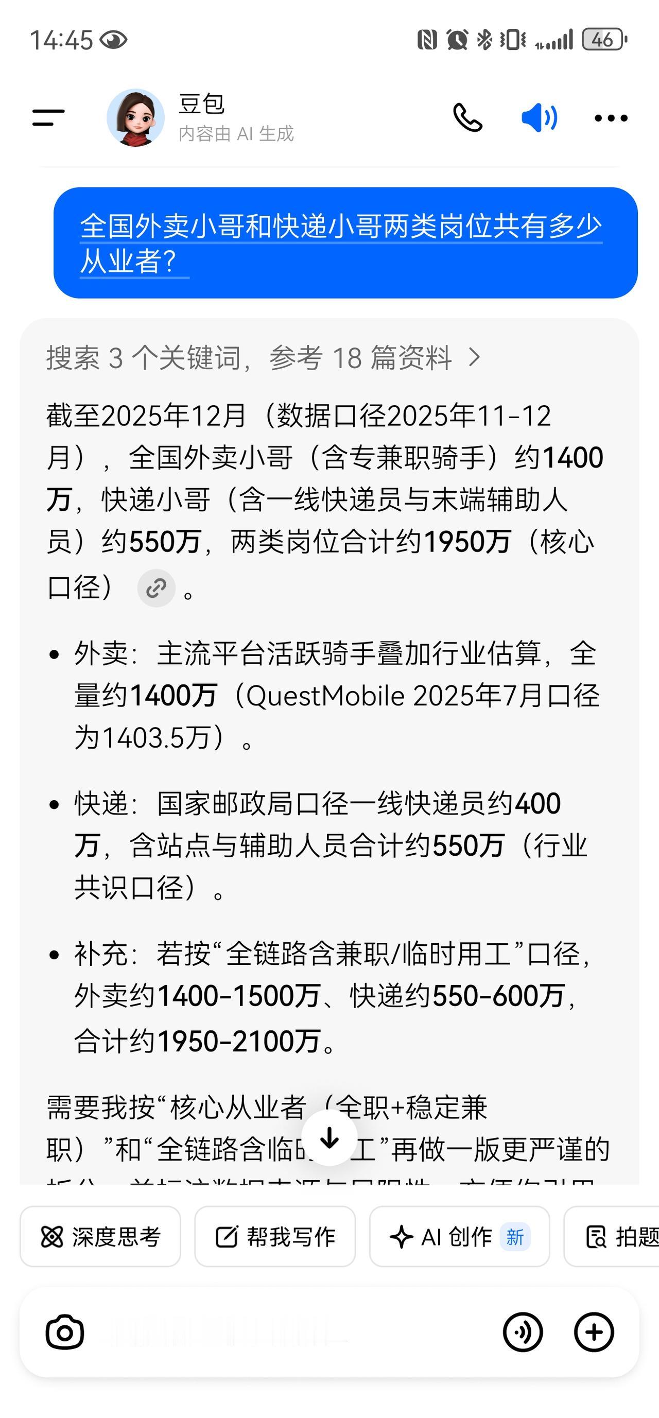 如果无人驾驶汽车普及,那么城市道路交通工具都不需要人类驾驶员。无人驾驶的典型业务是robotaxi,全面替代网约车司机。robotaxi还会对外卖和快递配送业务带来颠覆性影响。虽然不可能一步到位,但长期来看,会导致几千万人面临失业。网约车司机+出租车司机约1500万。外卖小哥+快递小哥约2000万。总共影响3500万就业人员。推广无人驾驶会导致多少人失业?