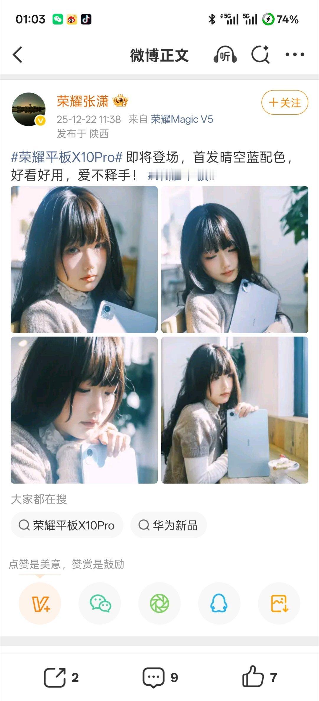 【荣耀平板X10 Pro官宣“即将登场”,首发晴空蓝配色】荣耀全场景产品线张潇宣布,荣耀平板 X10 Pro“即将登场”,新机主打好看好用,并首发晴空蓝配色。目前荣耀官方暂未公布这款新机的具体信息,作为参考,荣耀平板产品目前分为 Magic 系列、GT 系列、V 系列、数字系列和 X 系列。荣耀平板 X9 Pro 发布于去年 12 月底,配备 11.5 英寸 120Hz 屏(分辨率 2000×1200 / 峰值亮度 400nits / 色域覆盖 100% sRGB)+ 4 扬声器 + 8300mAh 电池,并搭载骁龙 685 处理器,定价 1099 元起。荣耀平板X10Pro荣耀平板