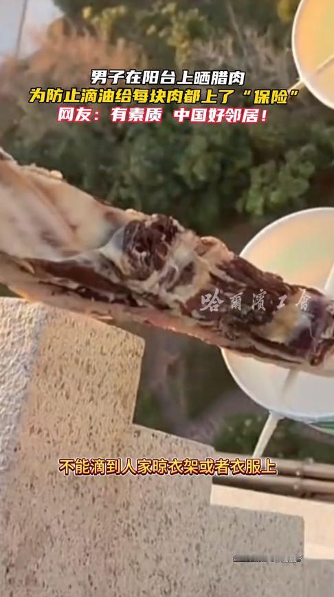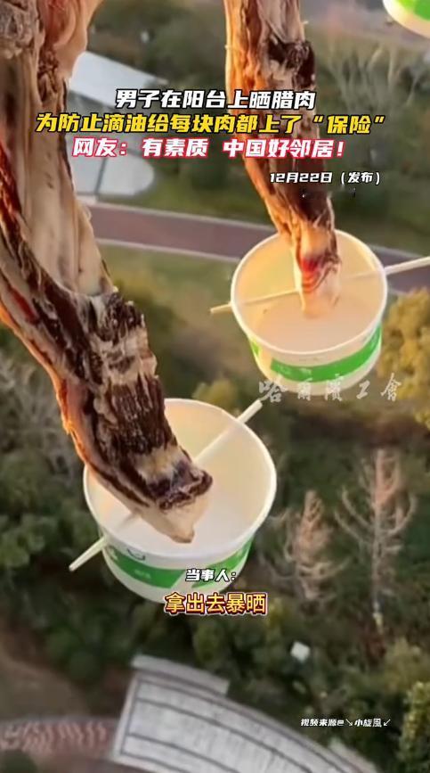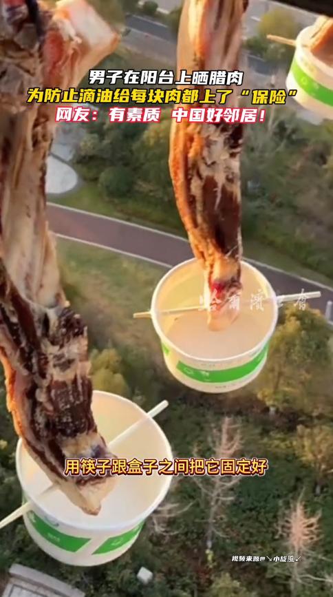 “人怎么能这么聪明!”12月15日,浙江舟山,一男子在阳台上晒腊肉,为了不让油滴到邻居晾晒的衣服上,他就在每块腊肉下面放了一个碗,然后用筷子和热熔胶固定好,这样一来就算刮风也不害怕了!网友:中国好邻居! 在南方地区,为了延长肉类的保质期,村民们会将肉悬挂在太阳底下暴晒,等到水分被彻底蒸干后,一块腊肉就做好了,吃的时候洗洗,再拿去烹饪就行了。 熊先生是江西人,虽然已经定居浙江十多年了,但是每年冬天,他还是习惯性的做几条腊肉,回味一下家乡的味道。 前不久,熊先生又开始在阳台上晒腊肉,他看到楼下有邻居在晒衣服、被子,担心晒出来肉油滴到人家衣物上,他还专门在每块肉下面放了个小碗。 可是一旦刮风,小碗就会被吹走,这样一来油可能还是会“误伤”,这时熊先生想到了新的办法,他找来筷子和热熔胶,将小碗固定在肉上,这下就不会出意外了! 熊先生将自己的方法分享到网上,立即就引起了网友们的关注,不少人都赞叹他是最好的邻居,时时刻刻为了邻居们着想,真是太善良了。 不少网友更是吐槽自己的邻居天天在家制造噪音,吵的自己睡不好觉,要是他们也能向熊先生学习学习,邻里关系要和睦不少! 信息来源:《男子在阳台上晒腊肉,为防止滴油给每块肉都上了“保险"。网友:将心比心的好邻居》观淄博