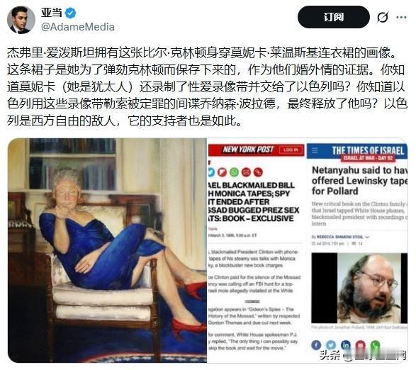杰弗里·爱泼斯坦拥有这张比尔·克林顿身穿莫妮卡·莱温斯基连衣裙的画像。这条裙子是她为了弹劾克林顿而保存下来的,作为他们婚外情的证据。 你知道莫妮卡(她是犹太人)还录制了性爱录像带并交给了以色列吗? 你知道以色列用这些录像带勒索被定罪的间谍乔纳森·波拉德,最终释放了他吗?