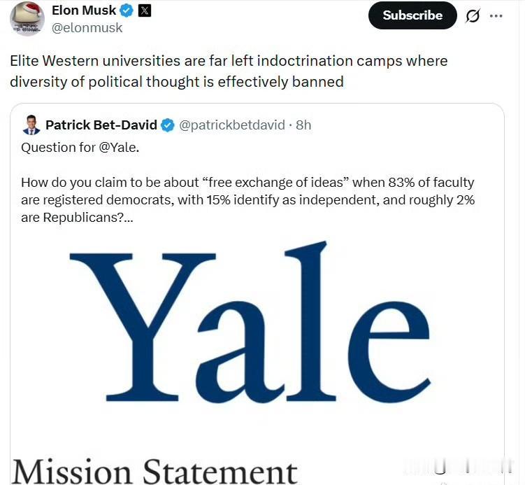 马斯克:西方精英大学是极左翼的洗脑营,在那里,政冶思想的多样性实际上被禁止了。