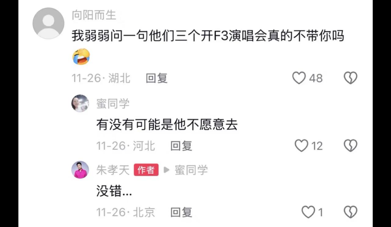 朱孝天在群里说阿信感谢他只是场面话,自己并没有收到任何消息! 阿信替补朱孝天的空缺,和F3连续数场举办《F✦FOREVER恒星之城》演唱会,他在终场抒发心声,坦言为了让F4重组,用尽了所有时间与能力,“虽然这不是所有人最期待的画面,但我会继续努力。”并在台上对朱孝天表示感谢。朱孝天在粉丝群中被问及此事时,不以为意地回应:“他说了好几次了,可是我这边没有收到任何消息……场面话,听听就算了吧……” 这…情商…真的不怕得罪人吗? 他自己回应里说,他正式拒绝了,完了又觉得人家不带他玩。纯小牌大耍,拒绝了还想人家舔着脸来求他吗? 朱孝天被移.出真不一定是别人排挤他,F4哥仨都出席了,难道就他一个需要那么多人低声下气去求吗?能合就合,不合也没啥,另外三位粉丝比他多多了吧,合体少了他也没事。 阿信是明白很多人对完整的“F4”还是有眷恋、有期待,所以说这样的话给人安慰。他说这种回应就……能理解很久不在一起工作的人各有各的工作节奏、能不能凑在一起会有很多干扰因素,不管是沟通有误还是没有谈拢,你没来其实也行,但是说这话真的情商很低。