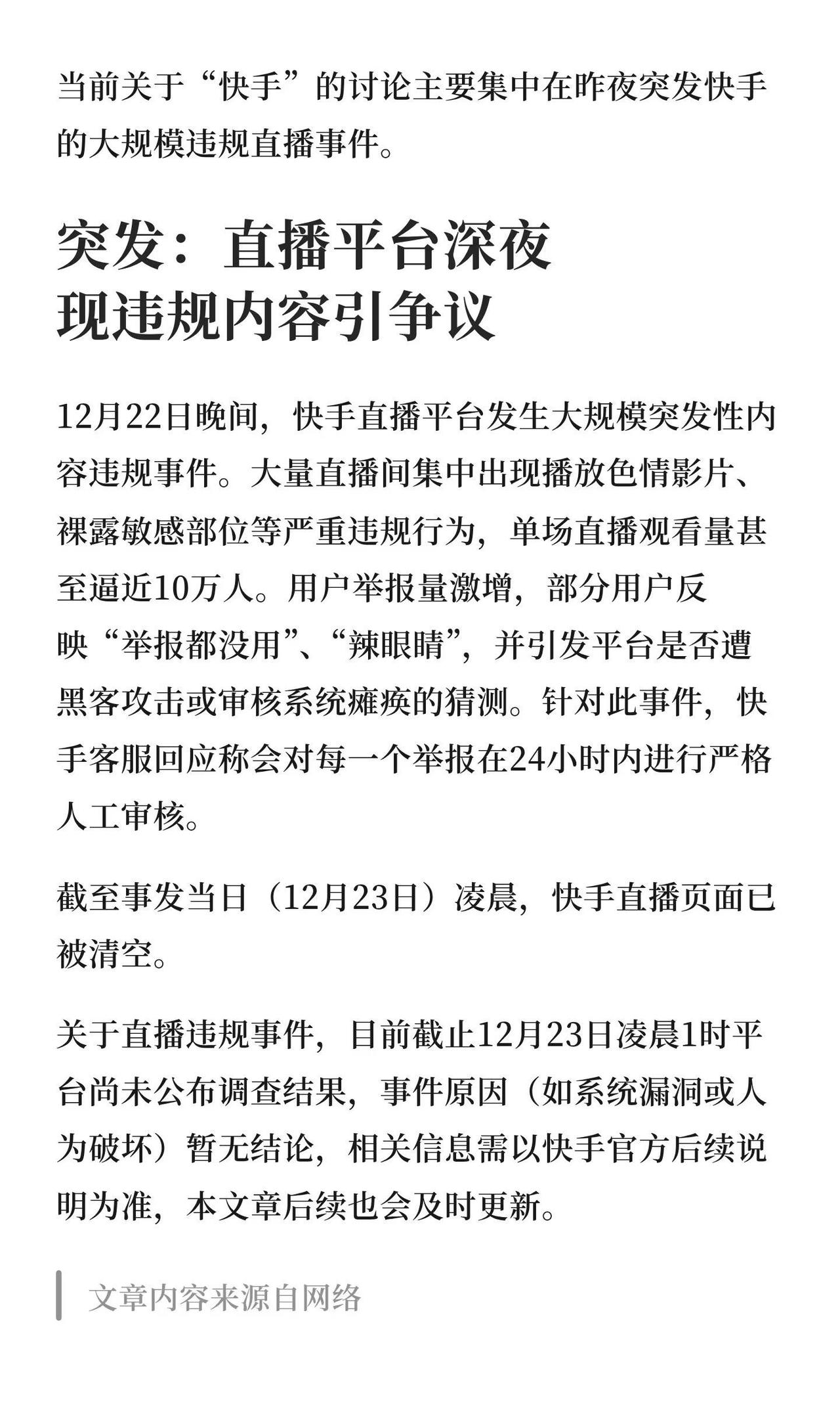 说说快手这两天的事儿吧。现在直播平台是真不太平,快手这一波大规模违规内容闹得挺大