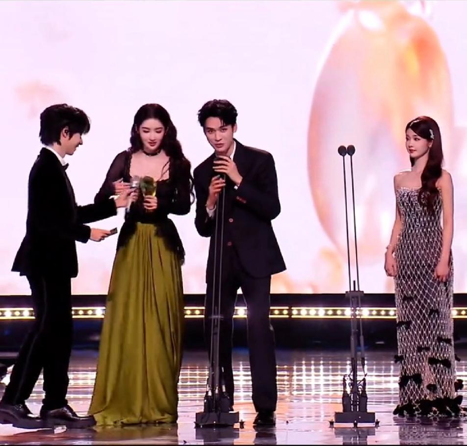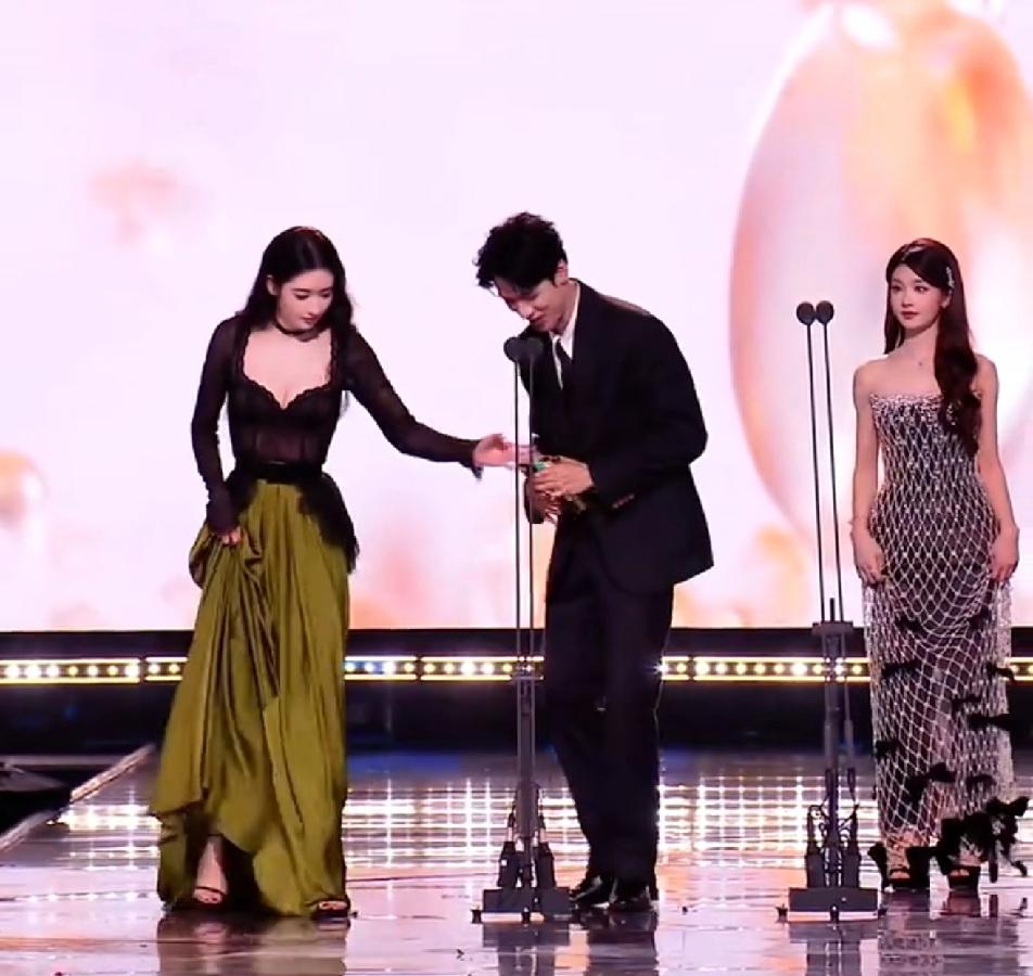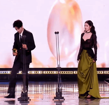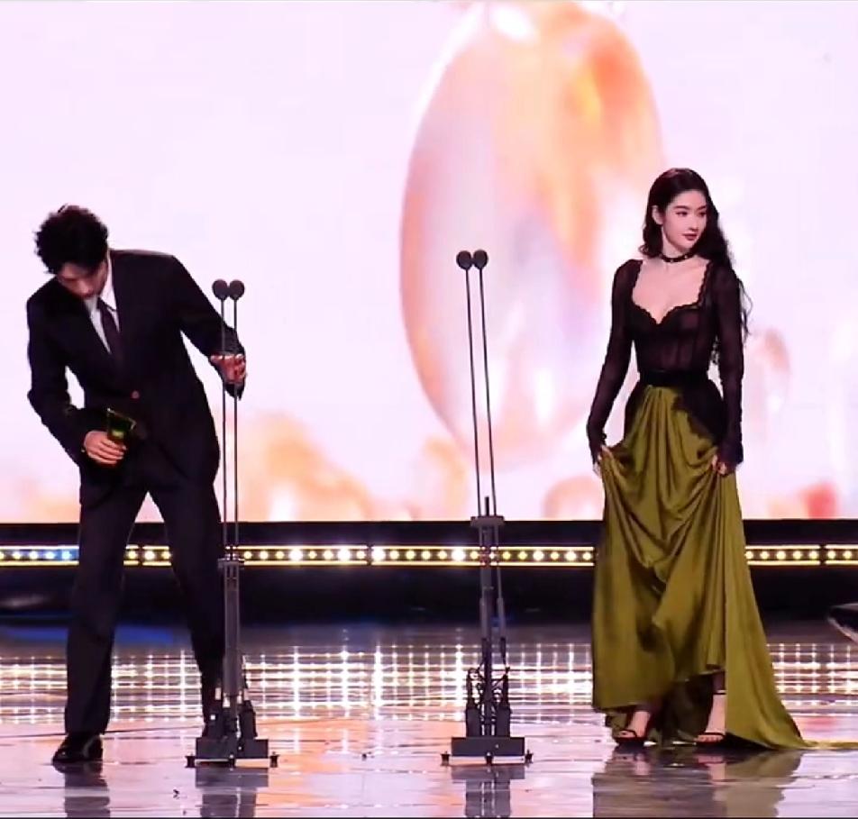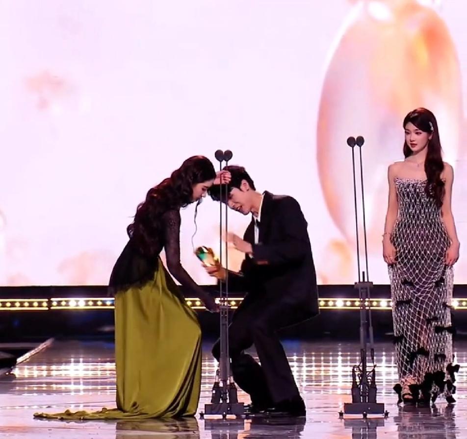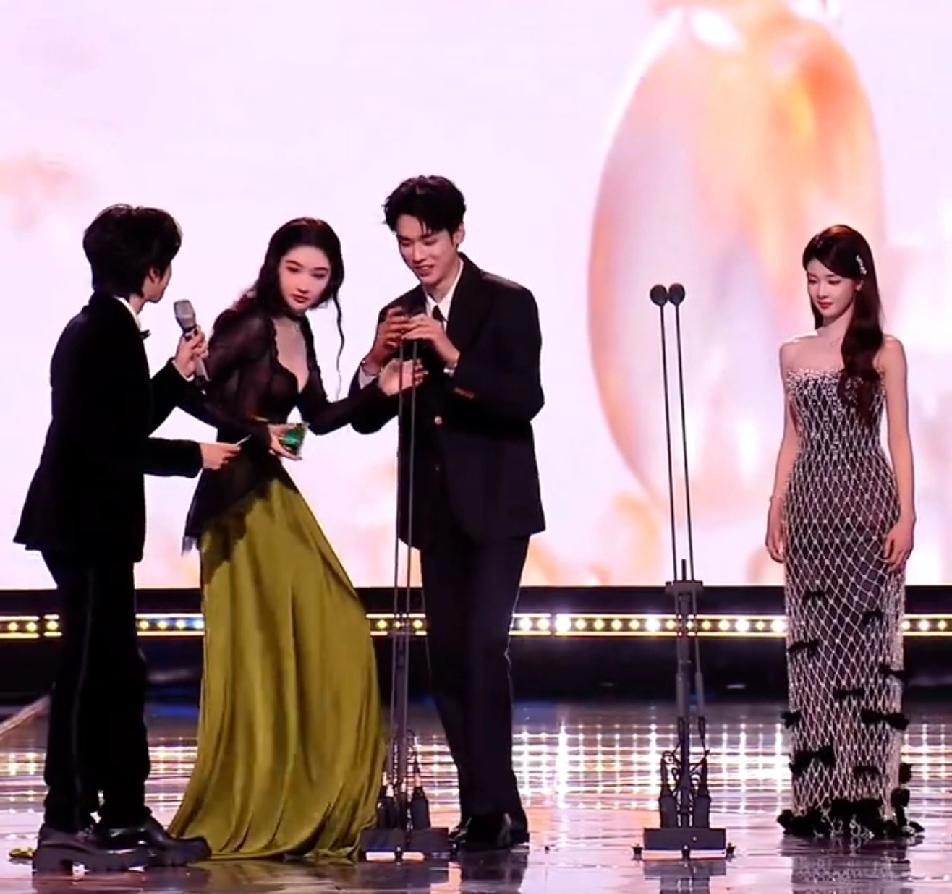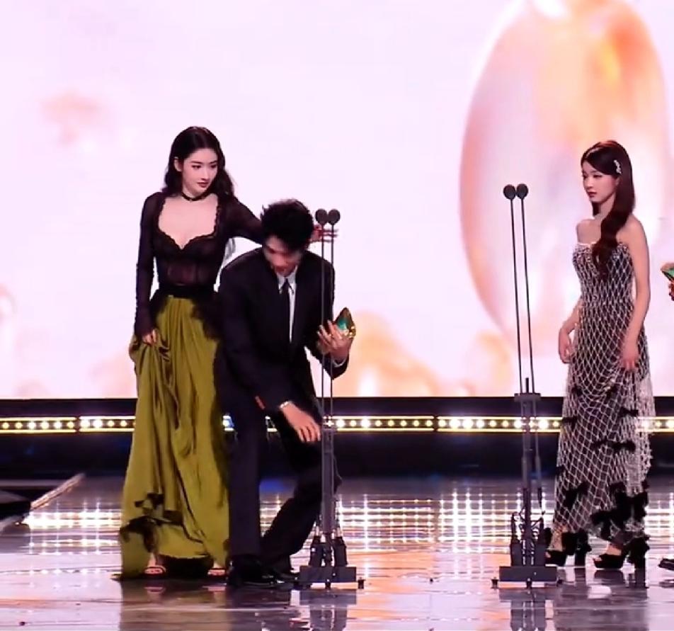 王玉雯,龚俊这是干嘛?真是俩眼里有活儿的好青年,王玉雯这是都上脚了?一个上台后跟话筒杠上了,一个就是热心市民赶紧帮忙,话说王玉雯真是一枚大大咧咧的搞笑女,她一点不顾自己穿着礼服和高跟鞋,又是蹲下调话筒,又是上脚帮着龚俊踩住话筒,两个人调试话筒调到浑然忘我,完全忘记他俩上来是干嘛的,旁边的姐姐尴尬了,站在那儿一点懵,也不知道自己该干点什么?主持人一看,如果不拉着,这俩“修理工”不知道要忙活到什么时候,于是赶紧上来阻止俩活宝,王玉雯和龚俊这才作罢了,这俩一起拍剧肯定很愉快,好沟通,毕竟都是傻憨憨……王玉雯 龚俊