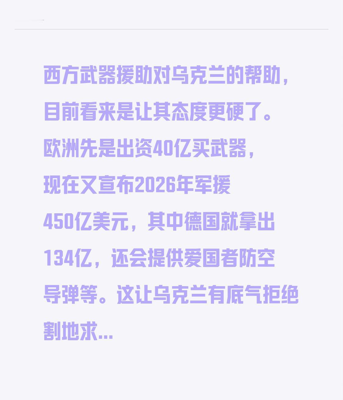 西方武器援助对乌克兰的帮助,目前看来是让其态度更硬了。欧洲先是出资40亿买武器,现在又宣布2026年军援450亿美元,其中德国就拿出134亿,还会提供爱国者防空导弹等。这让乌克兰有底气拒绝割地求和,既想保留军队、加入北约,又不想割让乌东四州。 但俄罗斯军队在各条战线已占优势,普京也表明若乌不想正经谈判,就要恢复历史领土。西方援助虽能给乌补充装备,可俄罗斯也不会坐以待毙,这场仗最终走向如何,还得看后续各方的行动和博弈。