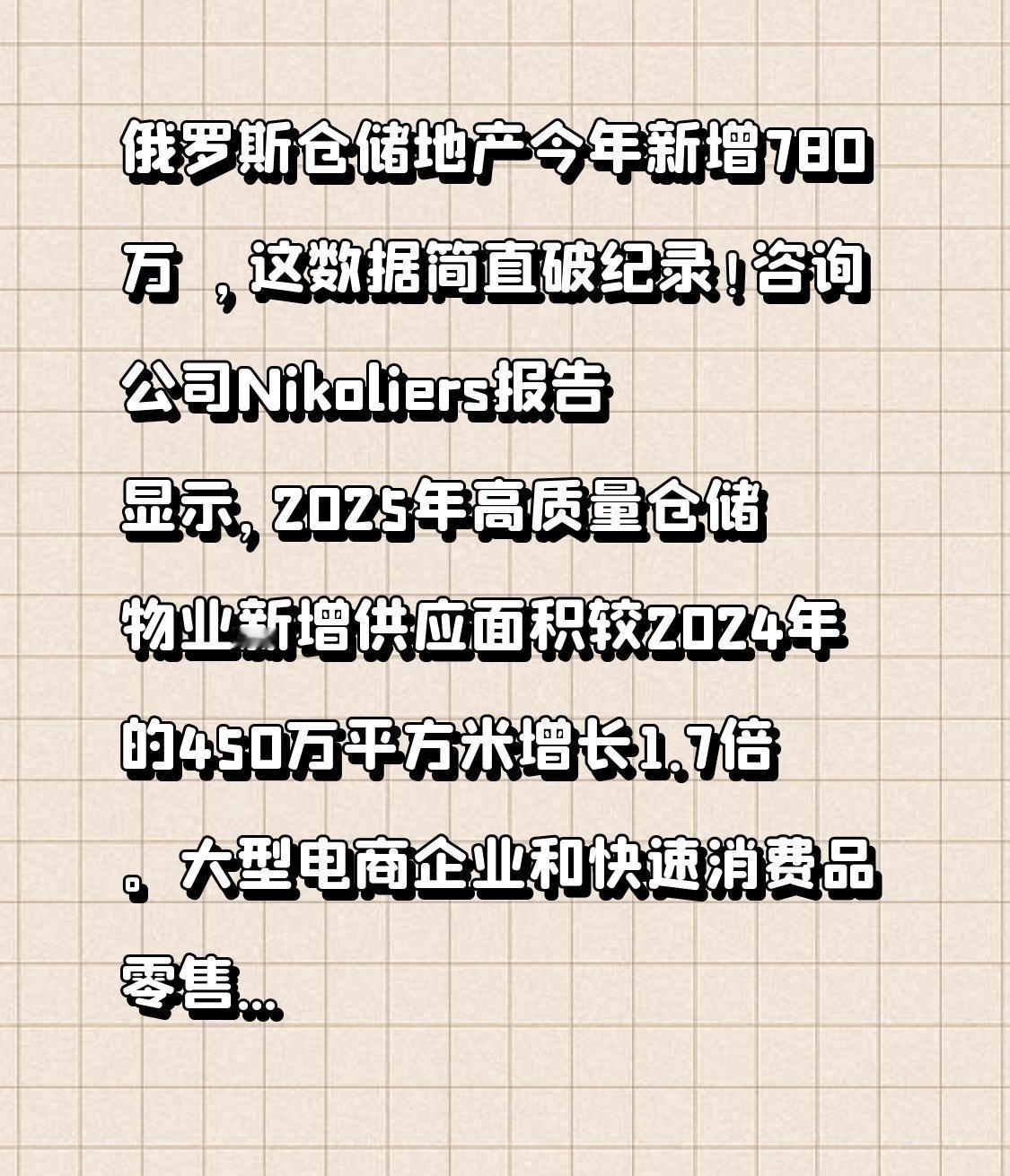 俄罗斯仓储地产今年新增780万㎡,这数据简直破纪录!咨询公司Nikoliers报告显示,2025年高质量仓储物业新增供应面积较2024年的450万平方米增长1.7倍。大型电商企业和快速消费品零售连锁店是扩张主力,它们建自有配送中心,签定制建设项目合同。 这增长背后有多重原因,2023 - 2024年仓储交易累积,加上去年关键利率上升使部分项目推迟到今年。专家预计增长趋势2026年还会延续,电商投资计划也将逐步落实,俄罗斯仓储地产未来值得关注。