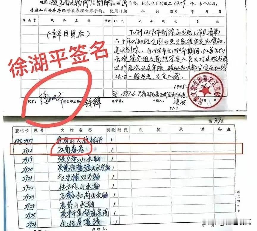 徐湖平还是太急于撇清关系了, 在采访中,又是说自己2008年已经退休了,此后所有的事自己都没有参与,又是说自己已经82岁,又是高血糖,而且前列腺还不好,意思就是说自己不但老了而且还病了,还能怎么样? 其实现在这事,就是要彻底查清楚原委真相,6800买到手,现在拍卖的指导价直接定了6800万,这差距确实有点大,关键是江南春卷,无论是调拨还是买卖都发生在2008年之前,而且关键还有徐湖平的签字,这个想赖也赖不掉。