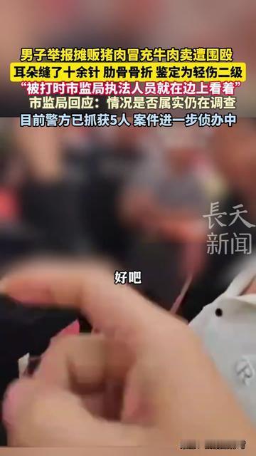 你见过维权最寒心的瞬间吗?举报假牛肉反被围殴,执法的就在边上看着! 广东一男子买肉,发现摊贩用猪肉冒充牛肉,找对方理论。 结果被围殴到耳朵缝十多针,肋骨骨折,鉴定轻伤二级! 他说最难受的是:“被打时市监局的人就在旁边,没拦!” 现在市监局在调查情况,警方已经抓了5个人。 普通人维权图啥?不就是想有个撑腰的吗?结果人家站旁边看你挨揍,这比被打还疼啊! 执法的在场,该不该立刻制止暴力?换成你,会觉得凉透了吗?