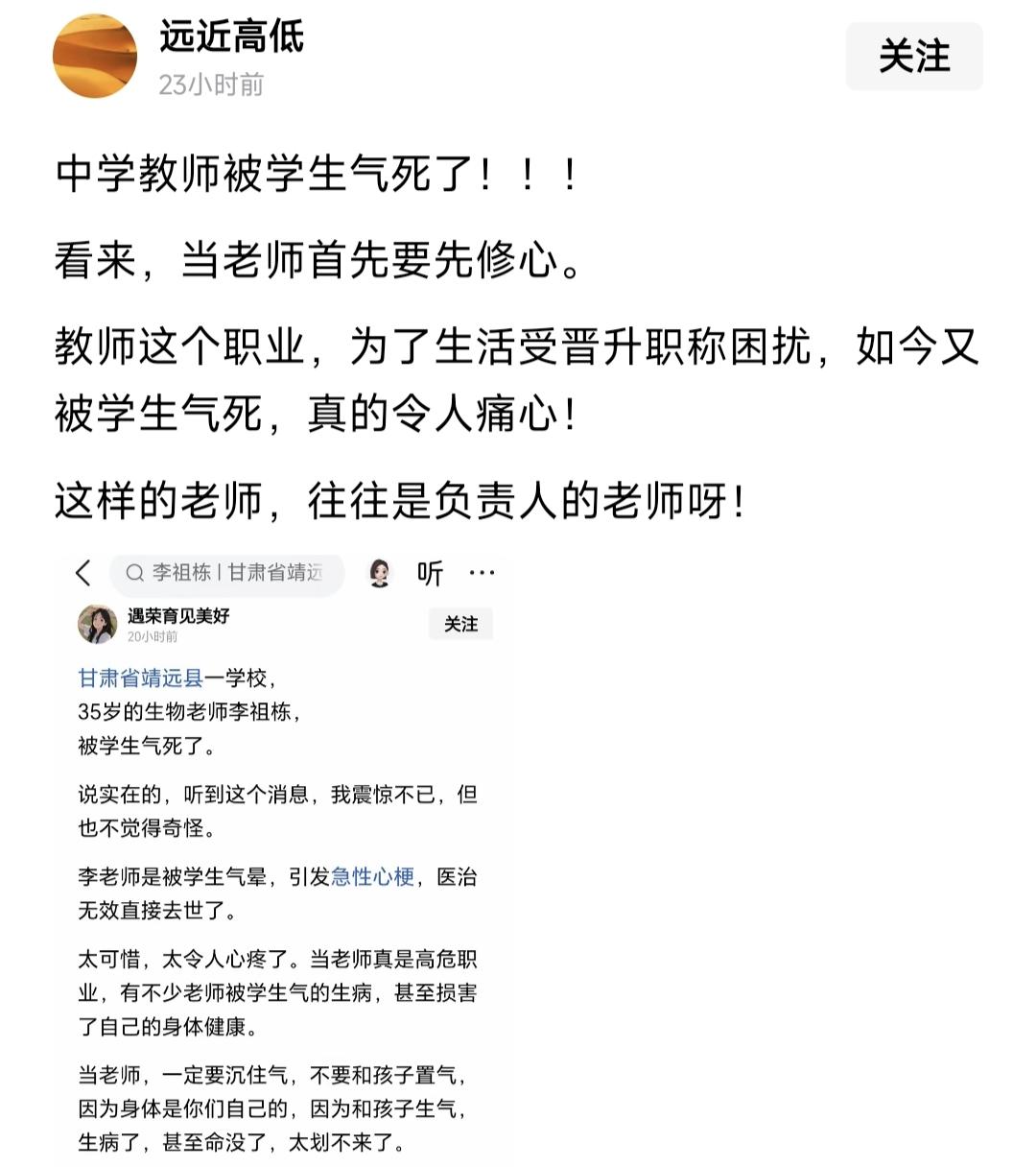 35岁的老生物老师,班主任李老师被学生气晕,引发心肌梗塞抢救无效去世。这一则消息