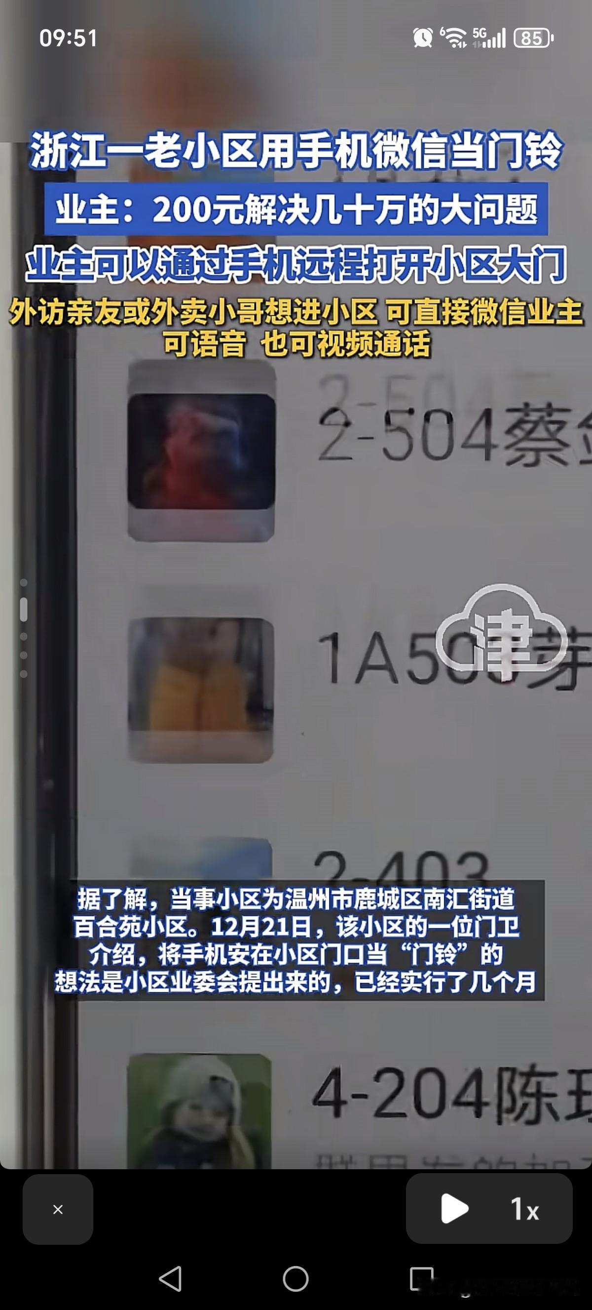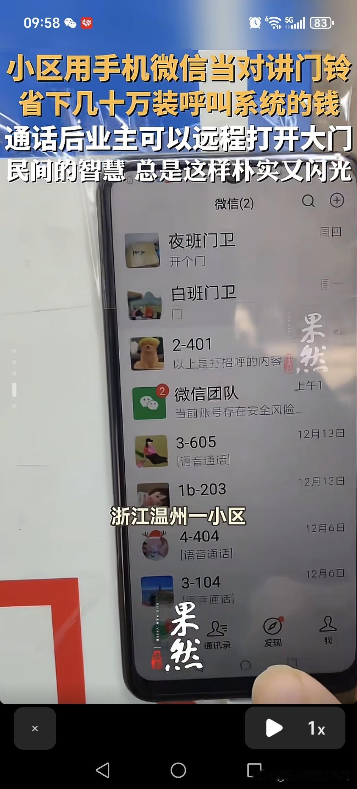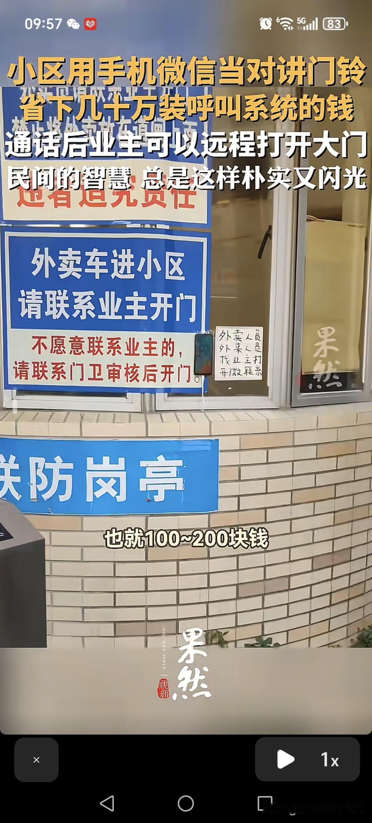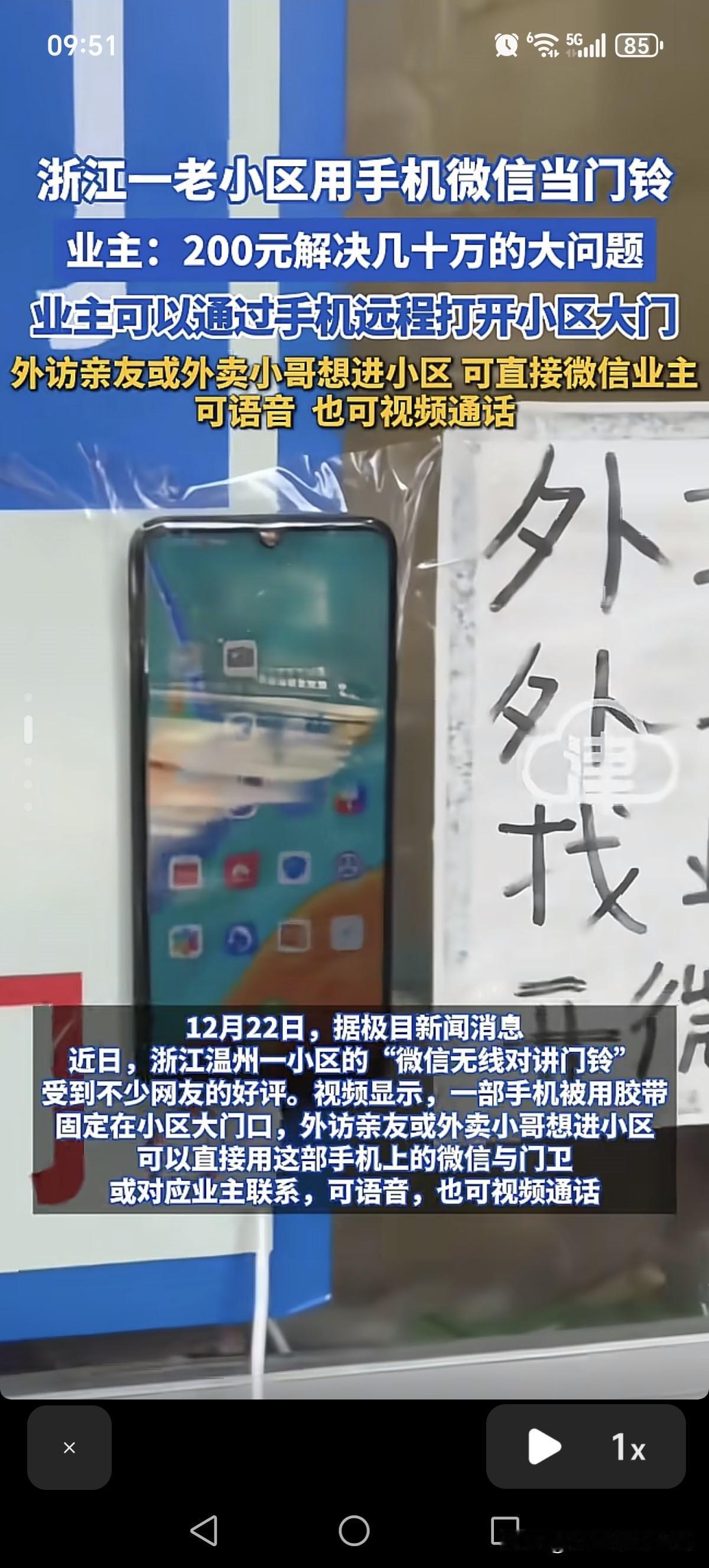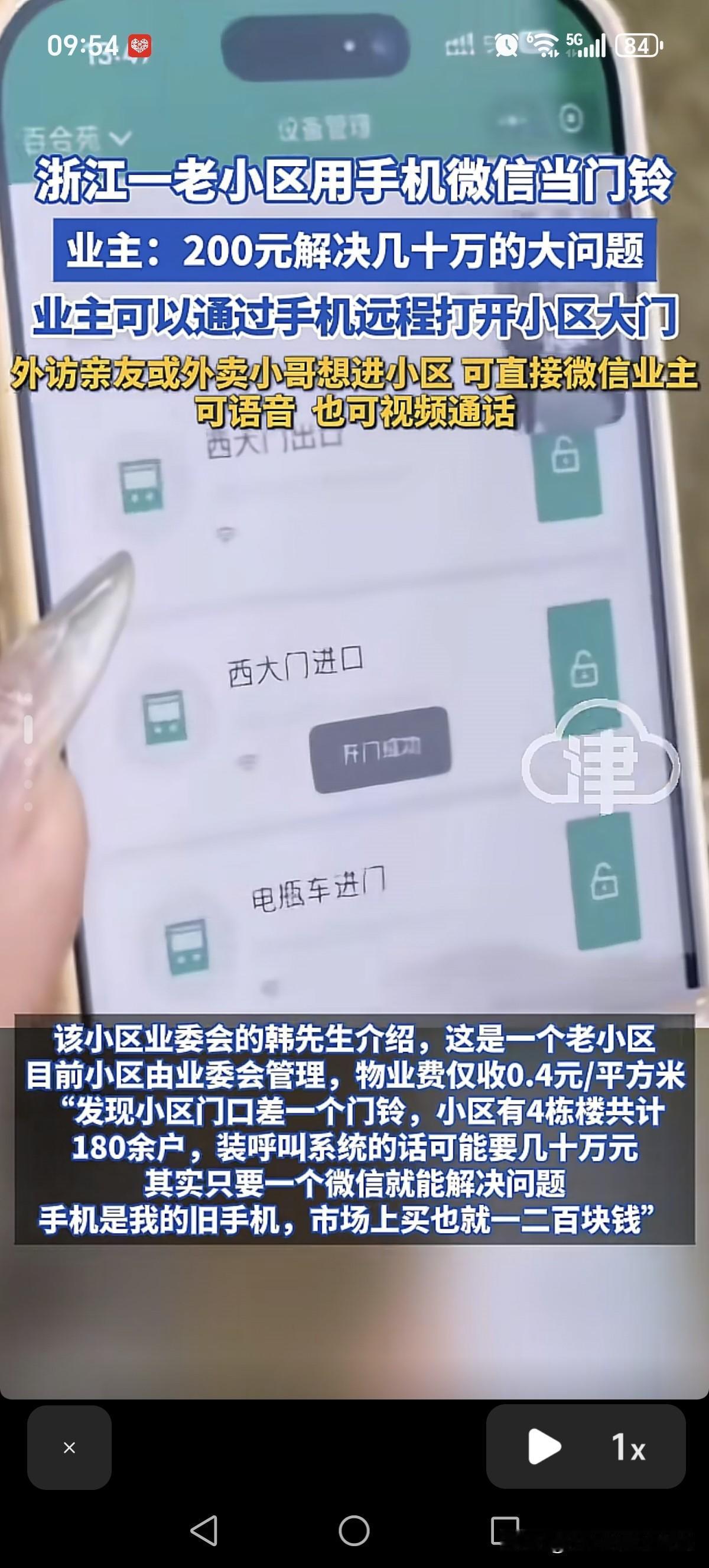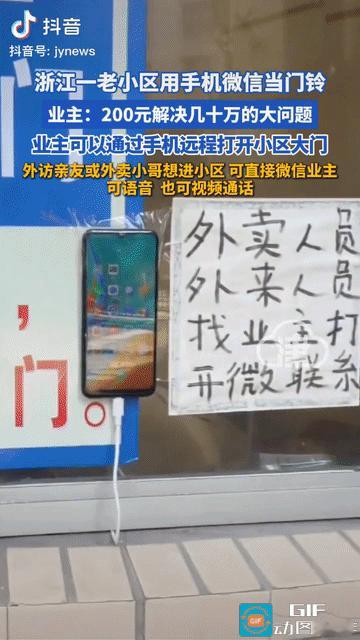 这小区业委会的人太有才了,用几百块解决了好几万的工程!近日,浙江温州的一个老小区火了,小区的门口放置了一部旧的手机,外卖小哥,快递员,访客等都可以通过这部旧手机的微信功能当做门铃! 温州的百合苑是一个老旧小区,最近出现了一个奇特的门铃,小区的门口有一部旧手机用胶带固定着,如果访客和外卖小哥到了,就可以通过这部旧手机通过微信视频功能呼叫业主,让业主确认后可以给他开门! 这个小区有4栋楼,住了180多户,一开始他们想要装1套呼叫系统,方便管理小区进出人员,但这样1套的系统可能要花费几十万,但考虑到住户不多,然后分摊的费用太高,小区的业委会想出了一个办法,用一部旧的手机,里面存了这180多户住户的微信,小区业主可以对这个账号关闭自己的朋友圈,防止外来人员查看隐私。 外卖小哥,快递员或者是访客到了门口之后,就可以利用这部手机联系业主,业主确认之后,可以通过手机程序再给来访人员打开门。当然这个肯定是配套门卫员,这种操作间接性也让门卫看见听到通信内容,保证人是外卖员或者认识的。 业委会的韩先生说,这部手机就是他不用的旧手机贡献出来的,市面上最多也就值一两百块钱,这种操作方式几乎是零成本了,但是解决整个小区的安全出入问题了,韩先生还说这为他们物业费的0.4元每平米的小区省下了一大笔开支! 不得不说,想出这个办法的人真有才!一部旧手机干掉了几十万的可视门禁。