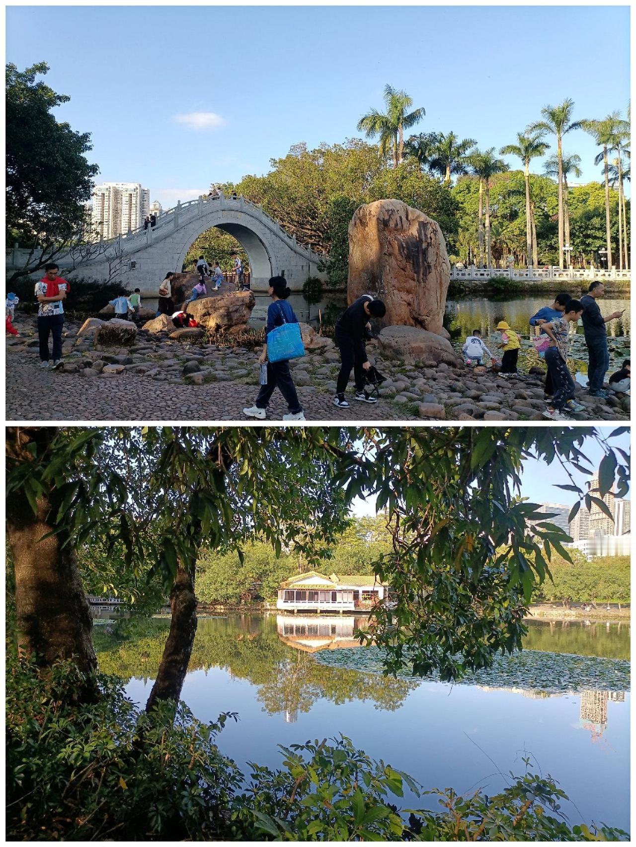 大抵深圳真是连公园也很甜蜜的。上午刚刚游玩了香蜜公园的,甜甜蜜蜜吃过中饭,下午原是按计划游览了荔枝公园(图1-5),再经历一把甜蜜。荔枝公园简直是几个湖或池塘拼接而成的,所以,湖光山色美丽不可方物的;到处是湛蓝湛蓝的水面和绿水青山的倒影;唯一的湖石沙滩成了众多游客的聚集地(图3上),享受宁静和远离尘嚣的快乐。 还感意犹未尽,就又驱车去了雪竹径公园(图6-9)。好大一片山林,这座山林清新自然,好极了,就象原始森林一般。空气清新的,去一趟犹如洗肺那么清爽的。本想沿着大道绕圈公园的,不料, 远远看见园里面的牌子,走进一看上面写着万里绿道,吓得两腿软软的,去下一个景点吧! 深圳 公园 甜蜜蜜 陏拍