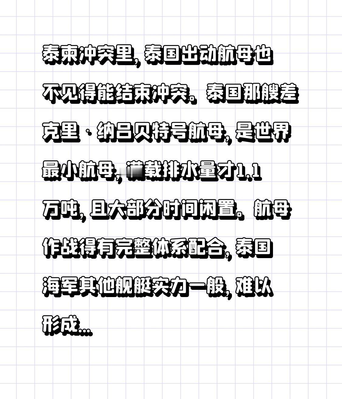 泰柬冲突里,泰国出动航母也不见得能结束冲突。泰国那艘差克里·纳吕贝特号航母,是世界最小航母,满载排水量才1.1万吨,且大部分时间闲置。 航母作战得有完整体系配合,泰国海军其他舰艇实力一般,难以形成强大战斗力。而且冲突不只是军事对抗,还有政治、外交因素。柬埔寨虽没航母,但有自己的防御体系,地形也复杂,航母作用有限。所以,光靠泰国出动航母,很难结束泰柬冲突,战争走向受多种因素交织影响。