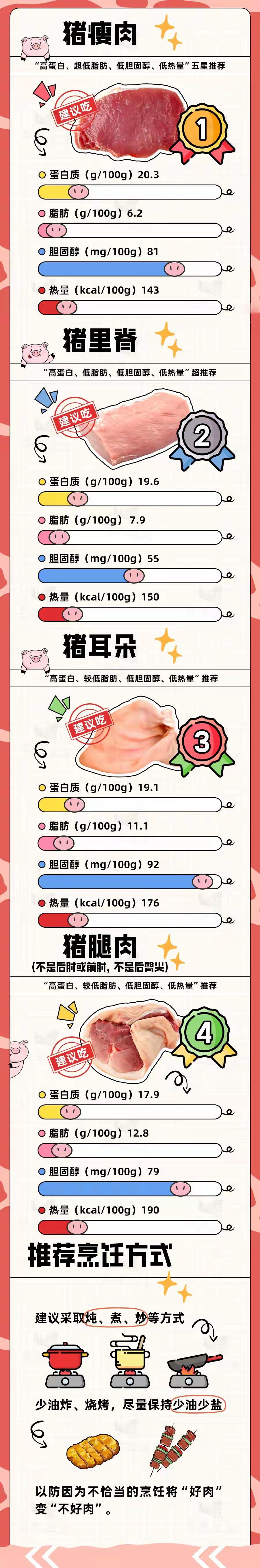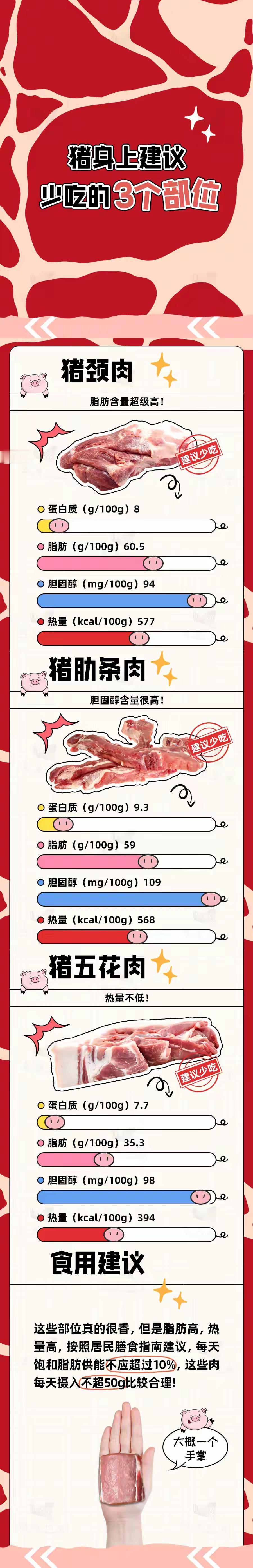 注意!这几个部位的肉,千万别吃 猪肉,是餐桌上常见的食材之一。但你知道猪的哪些部位吃了,会影响人体健康吗?一起来看↓↓↓ ✨按照“高蛋白、低脂肪、低胆固醇、低热量”的标准,4个部位建议吃:猪瘦肉、猪里脊、猪耳朵、猪腿肉。 ✨以“高脂肪、低蛋白、高胆固醇、高热量”的标准,建议少吃这3个部位:猪颈肉、猪肋条肉、猪五花肉。 ⚠️含有病变淋巴结的花子肉(肉枣)、含有甲状腺的粒子肉、含有肾上腺的小腰子,这些部位因含有病变组织或者内分泌腺,对健康有威胁,千万别吃! 接下来,让我们深入揭示那些隐藏在餐桌上的“隐形杀手”,为什么一些猪肉部位看似普通,却暗藏危机?你是否曾在餐厅点菜时犹豫不决?在超市挑选肉品时迷茫不已?今天,我们就用科学的角度,帮你拨开迷雾,避免“踩雷”。 首先,很多人喜欢猪肉的香嫩多汁,尤其是五花肉、肋条肉,那油光闪闪的诱惑难以抗拒。然而,正如你所看到的,脂肪含量高的部位,实际上是健康的“隐形杀手”。高脂肪、高胆固醇的猪颈肉、五花肉,虽然味道鲜美,但摄入过多,容易引发心血管疾病,尤其是对于有高血压、高血脂家族史的朋友,更要慎之又慎。 而那些“看似不起眼”的部位,比如猪耳朵、猪腿肉,虽然是营养丰富的蛋白质来源,但如果处理不当,可能带来细菌或寄生虫的风险。更别提那些“特殊”部位——猪花子肉、粒子肉和小腰子。这些部位,很多人并不陌生,但你知道吗?它们可能藏有病变淋巴结、甲状腺组织,甚至肾上腺,随意食用,可能引发免疫系统紊乱或激素失衡。 这就像我们在生活中常说的“看人看表面”,其实更应“看肉看内在”。一个肉品的选择,反映出我们对健康的态度。我们都希望在享受美味的同时,远离疾病的威胁。这不仅仅是关于食材的选择,更是一种生活的智慧。 很多人可能会问:“那么,哪些部位可以放心吃?”答案很简单:瘦肉和里脊。它们脂肪少、蛋白质丰富,是日常营养的最佳保障。合理搭配,既能满足味蕾,又能守护健康。 最后,提醒大家:在购买猪肉时,别只看价格和外观,更要关注来源和部位。选择正规渠道,避免购买含有异常组织的肉品。吃肉,讲究科学和理性,才能真正享受美味的同时,守护自己和家人的健康。 所以,下次再看到那些诱人的猪肉部位时,别只顾味蕾的满足,也要用心“挑选”,让健康成为你的生活常态。毕竟,健康无价,懂得取舍,才是真正的智慧。你有什么关于猪肉的“避雷”经验?欢迎留言分享,让我们一起成为健康生活的守护者!吃肉的禁忌 猪身上最香的肉