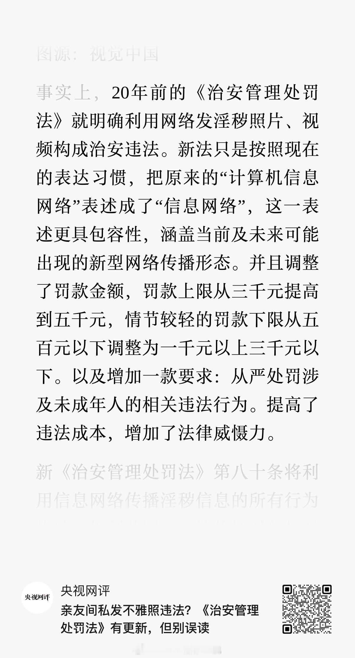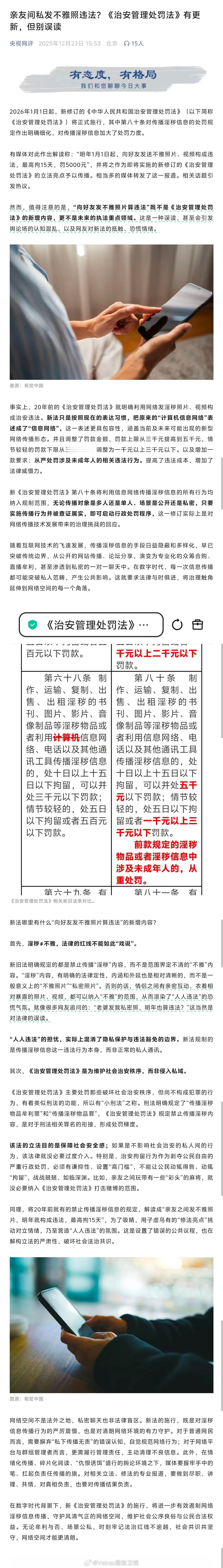 昨天一众地方媒体大提特提所谓的『向好友发送不雅照片、视频构成违法,最高拘15天,罚5000元”』,今天央视网刊发长文,指出这是对《治安管理处罚法》更新的明显误读:·这条内容并不是新条款:20 年前的《治安管理处罚法》就明确利用网络发淫秽照片、视频构成治安违法。新法只是按照现在的表达习惯,把原来的“计算机信息网络”表述成了“信息网络”。把这条内容单独拿出来裁切条款大书特书的媒体的用心在哪里,这不很明显了么……· 条款里新加入一款要求:从严处罚涉及未成年人的相关违法行为,昨天大炒特炒的媒体怎么不提这个呢……央视网评论指出:『“人人违法”的担忧,实际上混淆了隐私保护与违法豁免的边界。新法规制的是传播淫秽信息这一违法行为本身,而非正常的私人通讯。』『同理,将20年前就有的禁止传播淫秽信息的规定,解读成“亲友之间发不雅照片,明年就构成违法,最高拘15天”,为了吸睛,用子虚乌有的“修法亮点”挑动对立情绪,乃至营造“人人违法”的氛围。这是设置了错误的公共议程,也在解构立法的严肃性,破坏社会法治共识。』但你以为只是『误读』么……故意裁切条款放大传播设置公共话题,你再看看昨天努力讲这个话题拱上热搜的是哪几家媒体,再想想这些媒体之前都干了什么事……天下哪会有这么简单的事情。