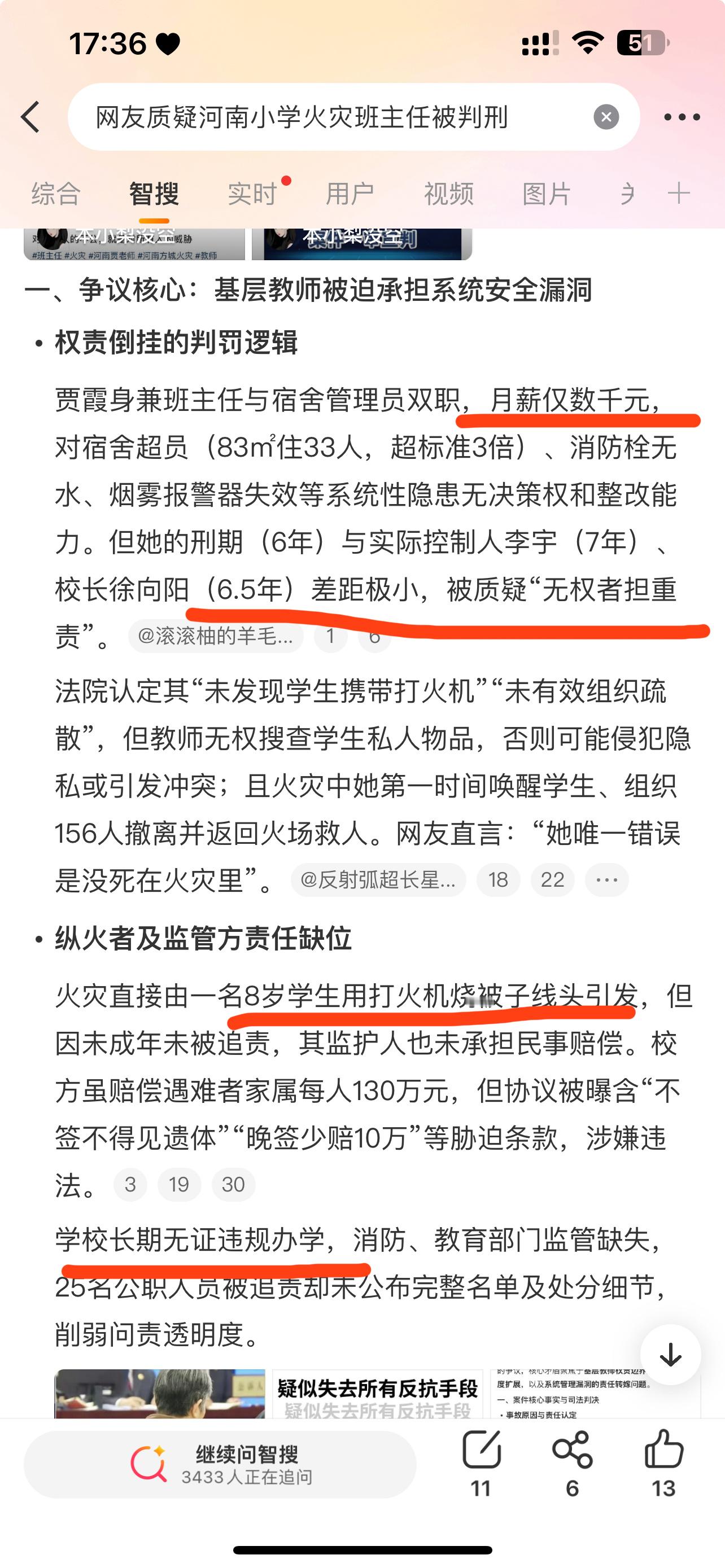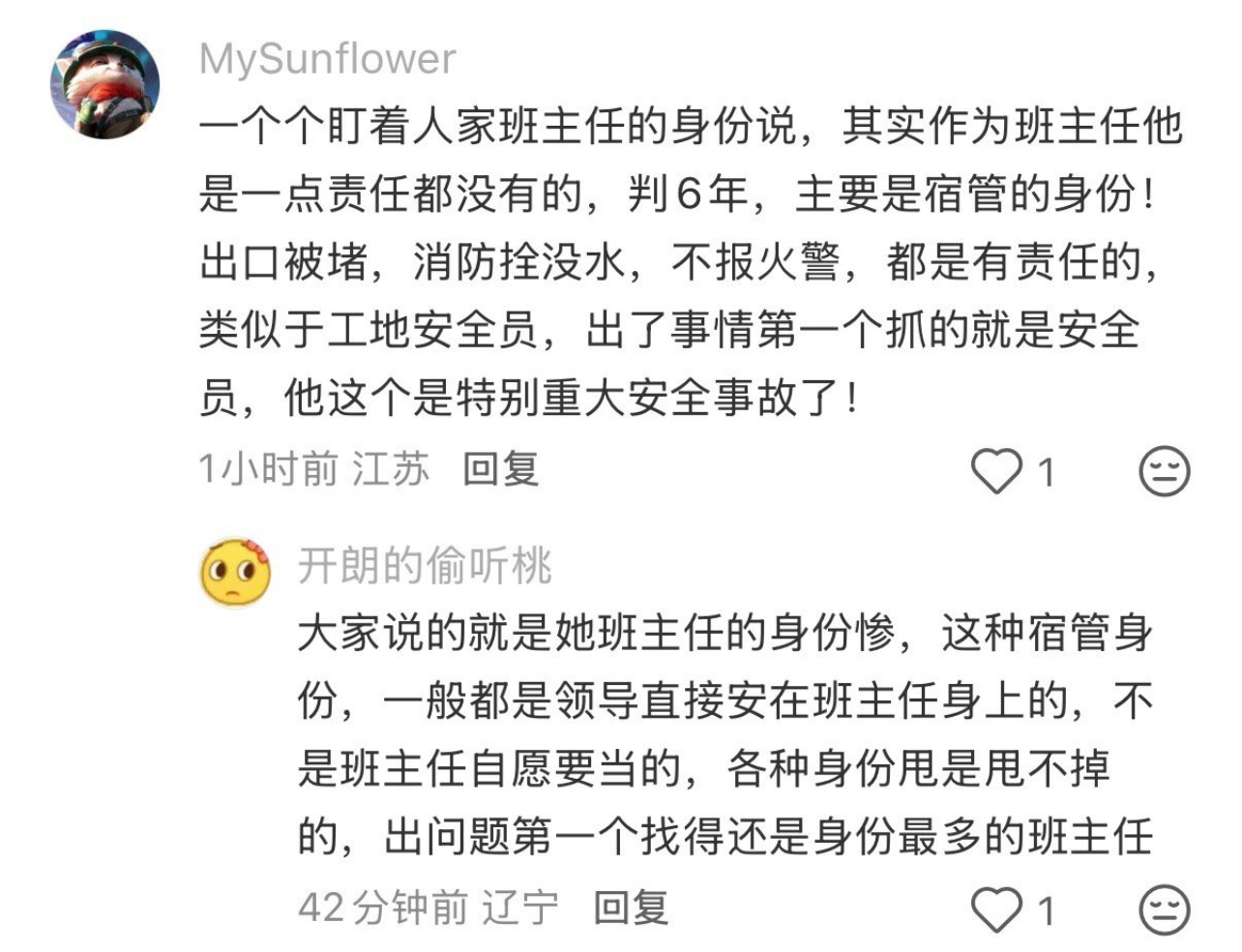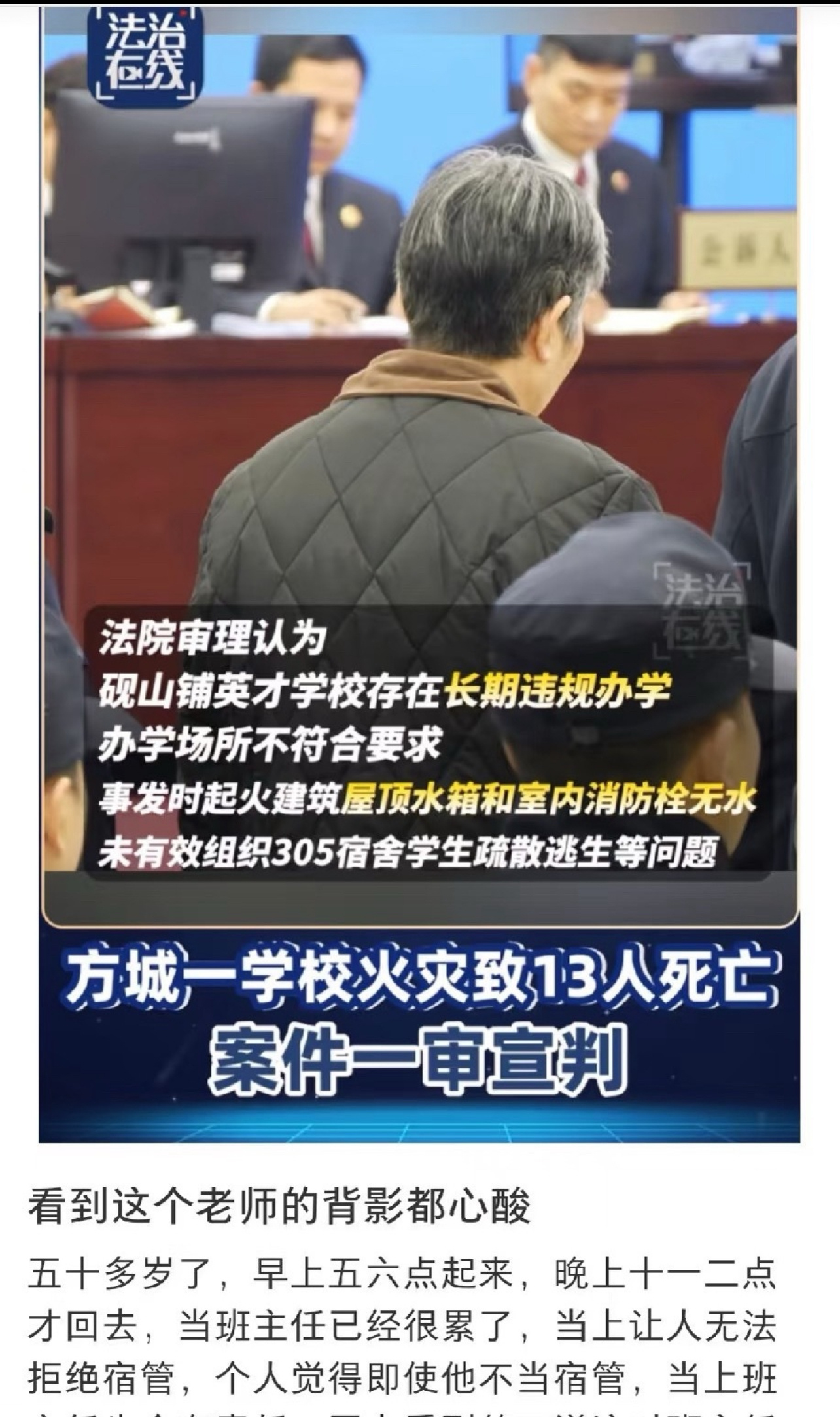 班主任兼任宿管这本就不合理,这是两个不同的工种,学校不管为了什么原因让班主任担任就不合适,大概率是强制安在班主任头上的。这样的话,班主任宿管就一点权力也没有(除了管管学生起床睡觉,是否带手机),其他涉及消防的事她一个近六旬的教师怎么懂得?这不妥妥的……网友质疑河南小学火灾班主任被判刑