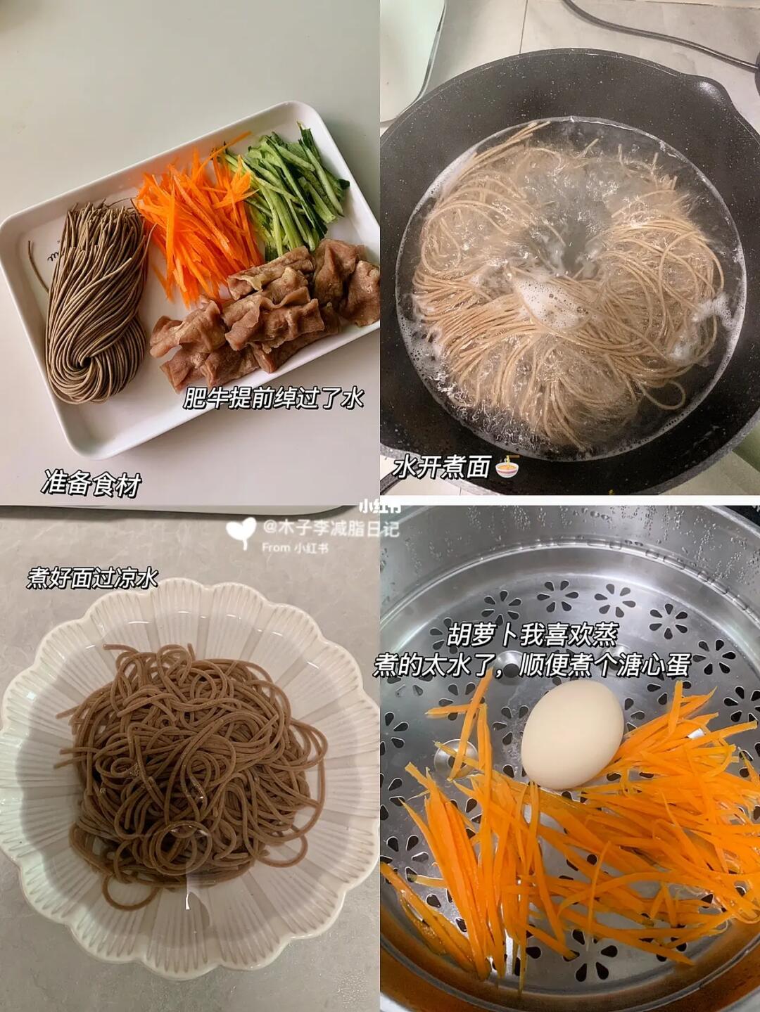 水开下荞麦面,煮熟过凉水!肥牛放料酒,姜片绰水,面放碗底码上黄瓜丝,胡萝卜丝~倒入酱汁~