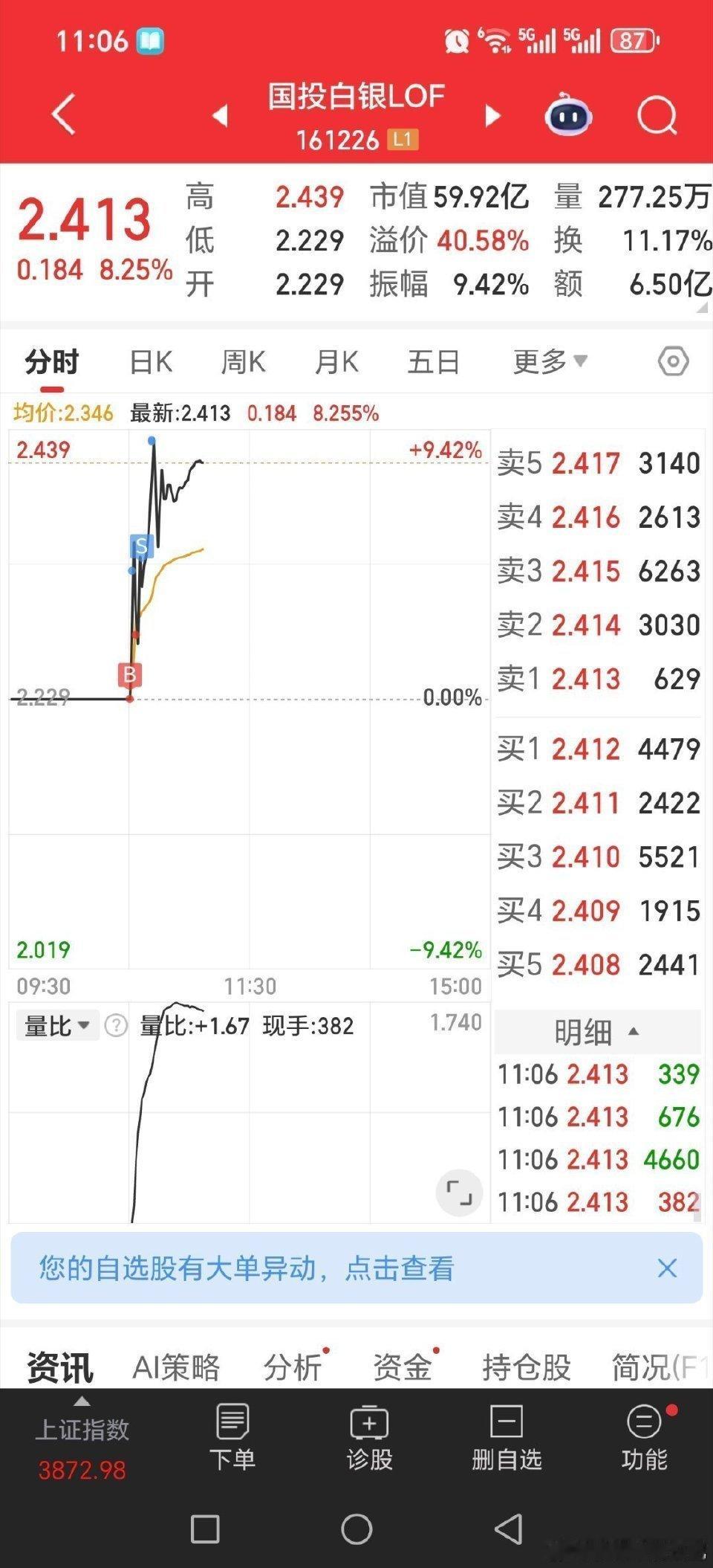国投白银lof,上周五负八抄底,周一两天17点卖了,又买回!!!周二接着涨停,今
